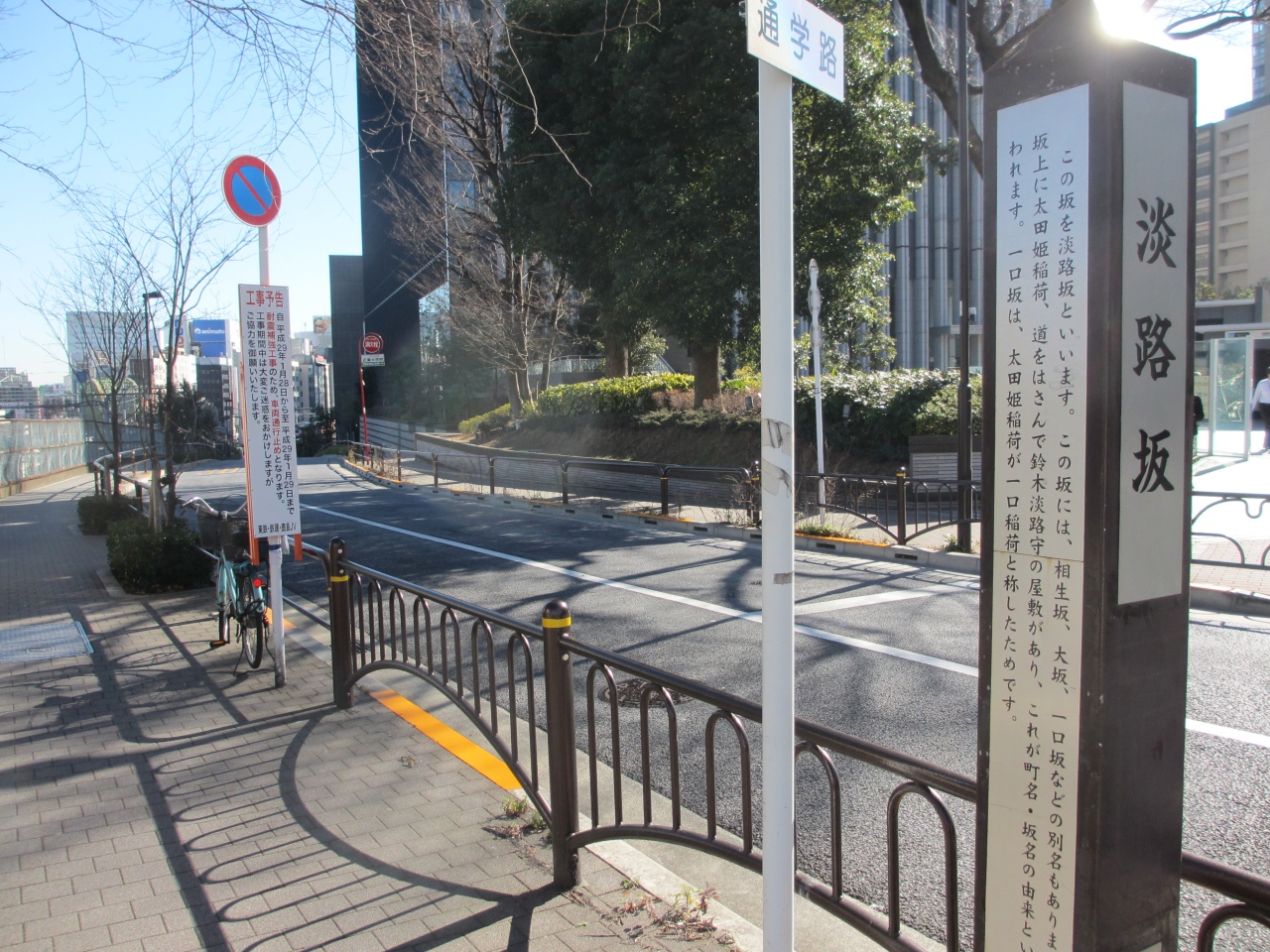 お茶の水界隈には数多くの坂道が存在し、その一つ一つに名前がついています。淡路坂はかつてこの付近に鈴木淡路守の屋敷があったことから名づけられました。今はJR御茶ノ水駅聖橋口前に建つ高層ビルのソラシティとJRの線路に挟まれたところに通っています。特に特徴がある坂道ではありませんが、近くにはニコライ堂や楽器街、湯島聖堂があり、少し歩くと神田明神や万世橋、秋葉原にも行くことができます。どこに行くにも便利な所に坂が存在するので、これらの場所を訪れた際にでも行ってみたらいかがでしょうか。