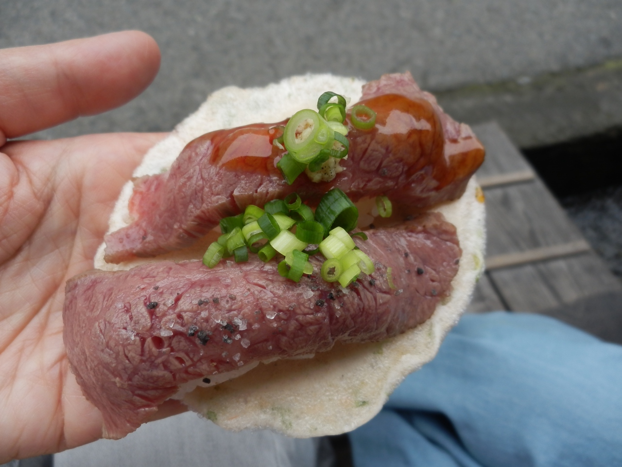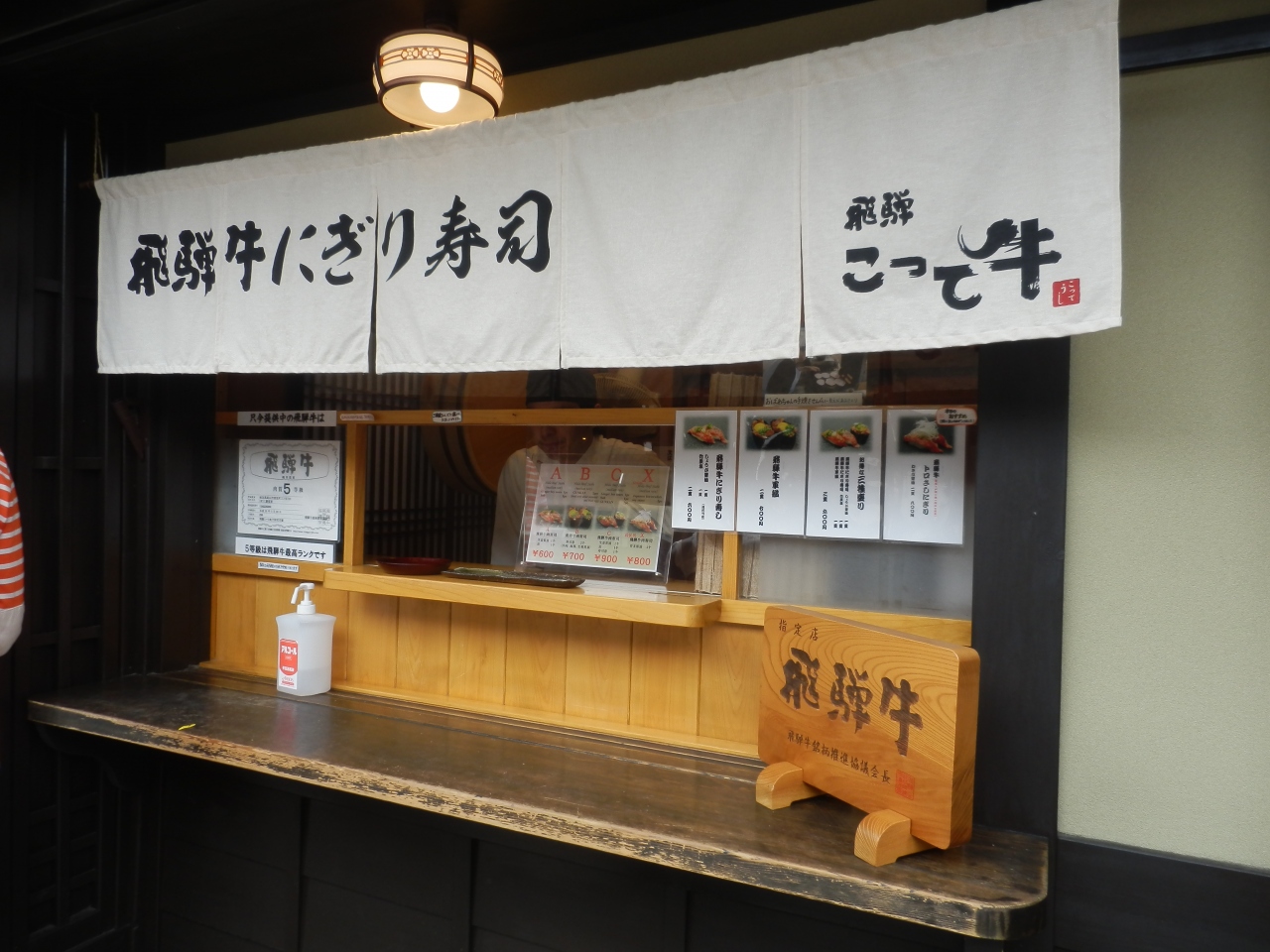 飛騨高山の古い街並みの通り沿いにあります。人だかりができているのですぐわかります。握りと軍艦がありますが、軍艦のほうが少し高いです。握りは少し甘めのたれがかかって、せんべいの上にのっているのも面白いです。飛騨牛もとても柔らかくおいしかったです。小腹がすいている時に丁度いいです。