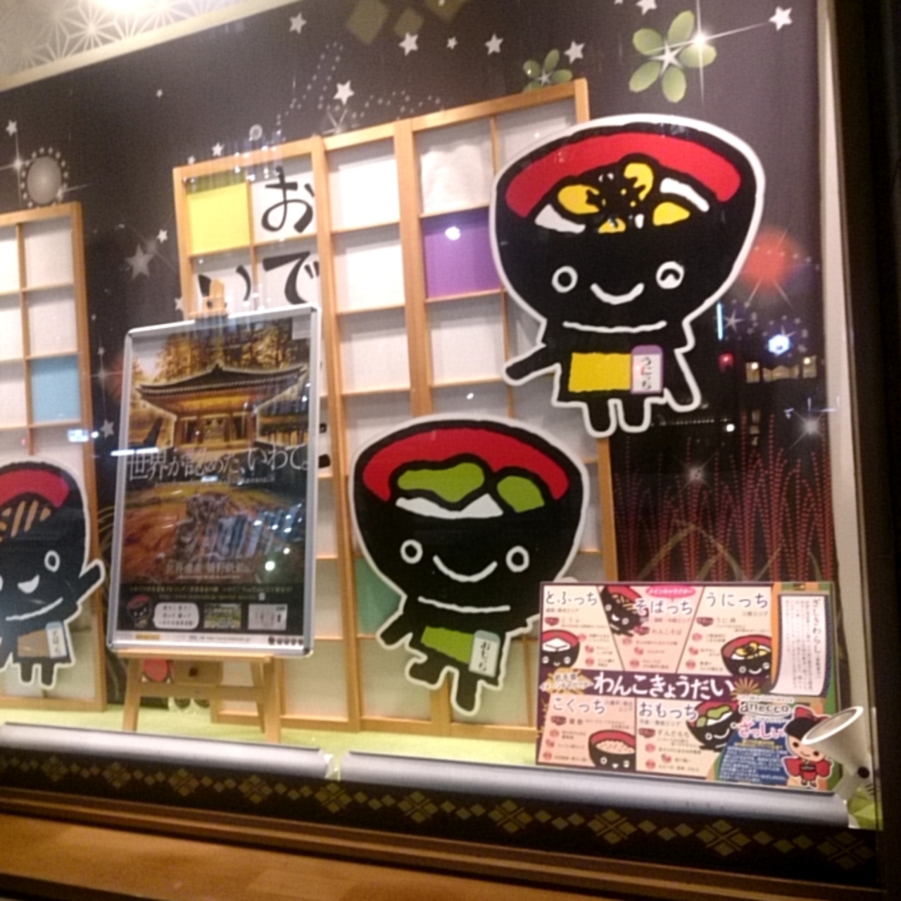 岩手県のアンテナショップとなっております。旅行に行ったばかりで、ちょうど前を通りかかったので立ち寄りました。店頭では、ご当地キャラクターのわんこ兄弟がお出迎えしてくれていました。最近気がつきましたがキャラクターに寄って具材が異なります。