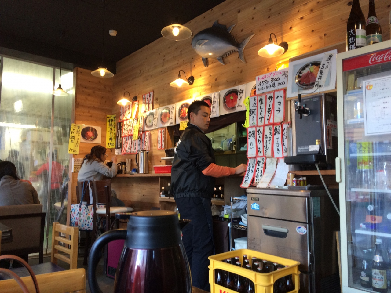 柳橋中央市場内の市場食堂です。市場内の入り口はビニールカーテンの仕切りでした。朝から買い物客で賑わっていました。私は「伊勢まぐろ丼」1500円を注文しました。新鮮な脂ののったマグロの切り身が豪快に乗っていました。なお、あら汁も付いています。