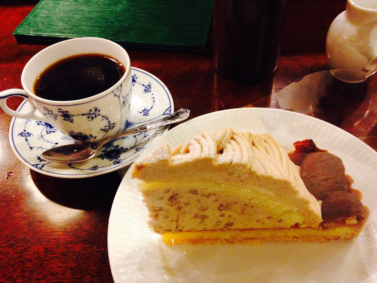 渋皮モンブランとブレンドのセット。いつも入れる砂糖とミルクもいらないコーヒーです。