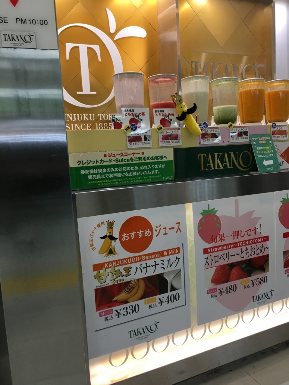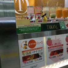 新宿駅東口改札の目の前にあるタカノフルーツのお店です。こちらはテイクアウトのみの店舗です。ケーキや焼き菓子の購入はもちろんですが、最近はジュースも飲めるようになりました。券売機はスイカに対応していませんでした。
