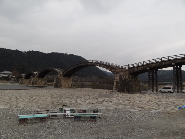 宮島観光に行ったついでに岩国にも立ち寄ろうという事になり錦帯橋へ行ってきました。橋の両脇に砂利の駐車場があります。バスはお金がかかるようですが乗用車は無料なのか何も書いておらず係りのかたにもなにも言われませんでした。橋はわたるのにお金がかかります。
