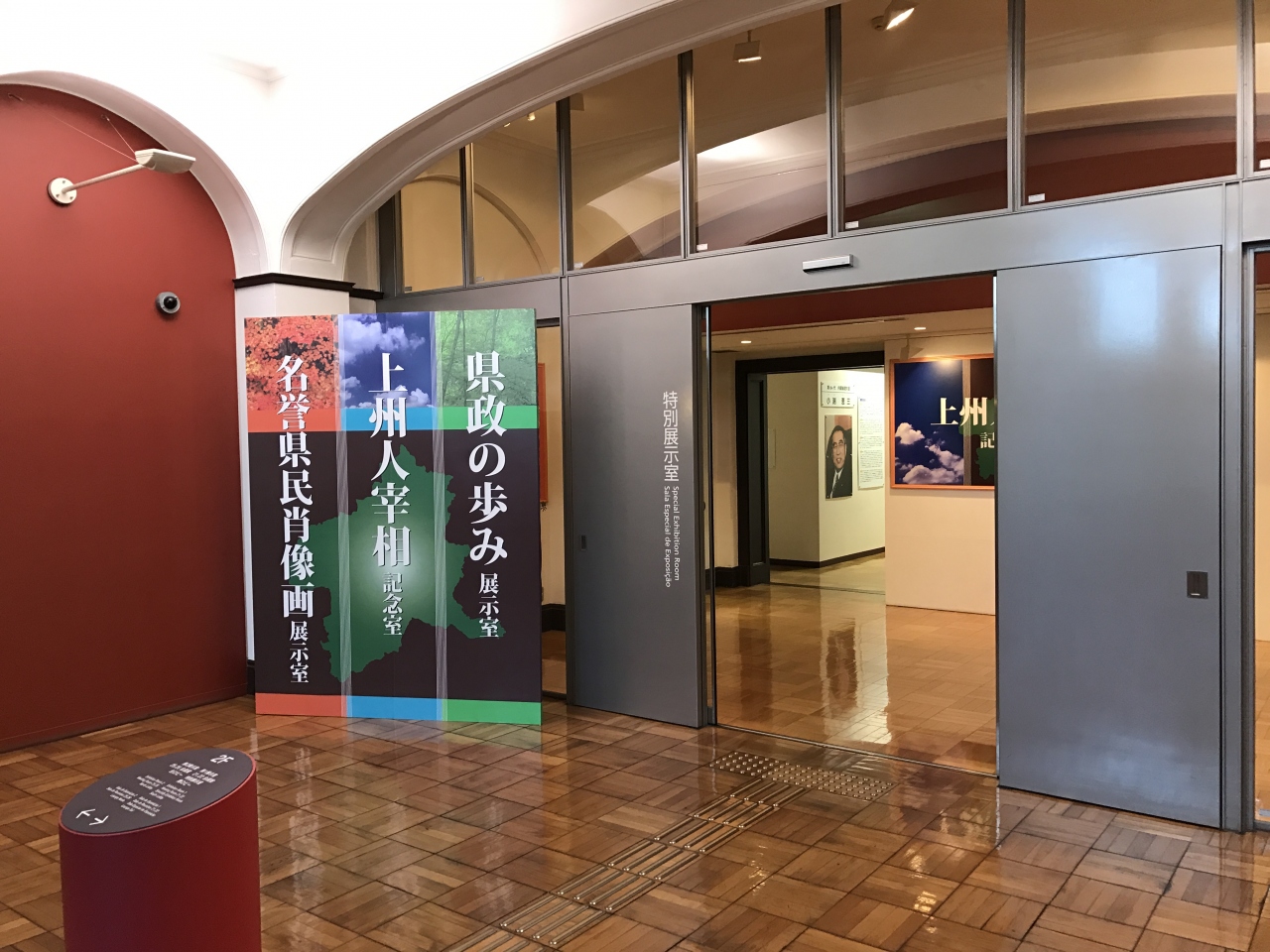 かつての群馬県庁ですが、今は資料館になっています。レトロな建物は健在で、1階にはカフェがありました。入口付近はヨーロッパの王宮を思わせるような豪華な造り。そしてエレベーターで3階に上がると、群馬県ゆかりの政治家のパネル展が行われていました。中曽根元総理に、小渕元総理、福田元総理まで。そうそうたる面々です。
