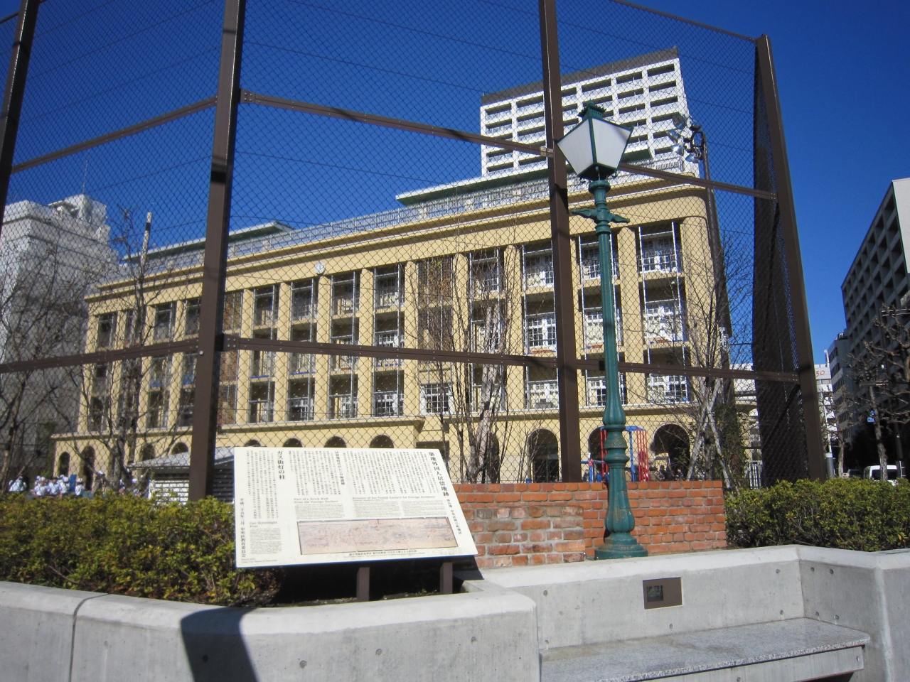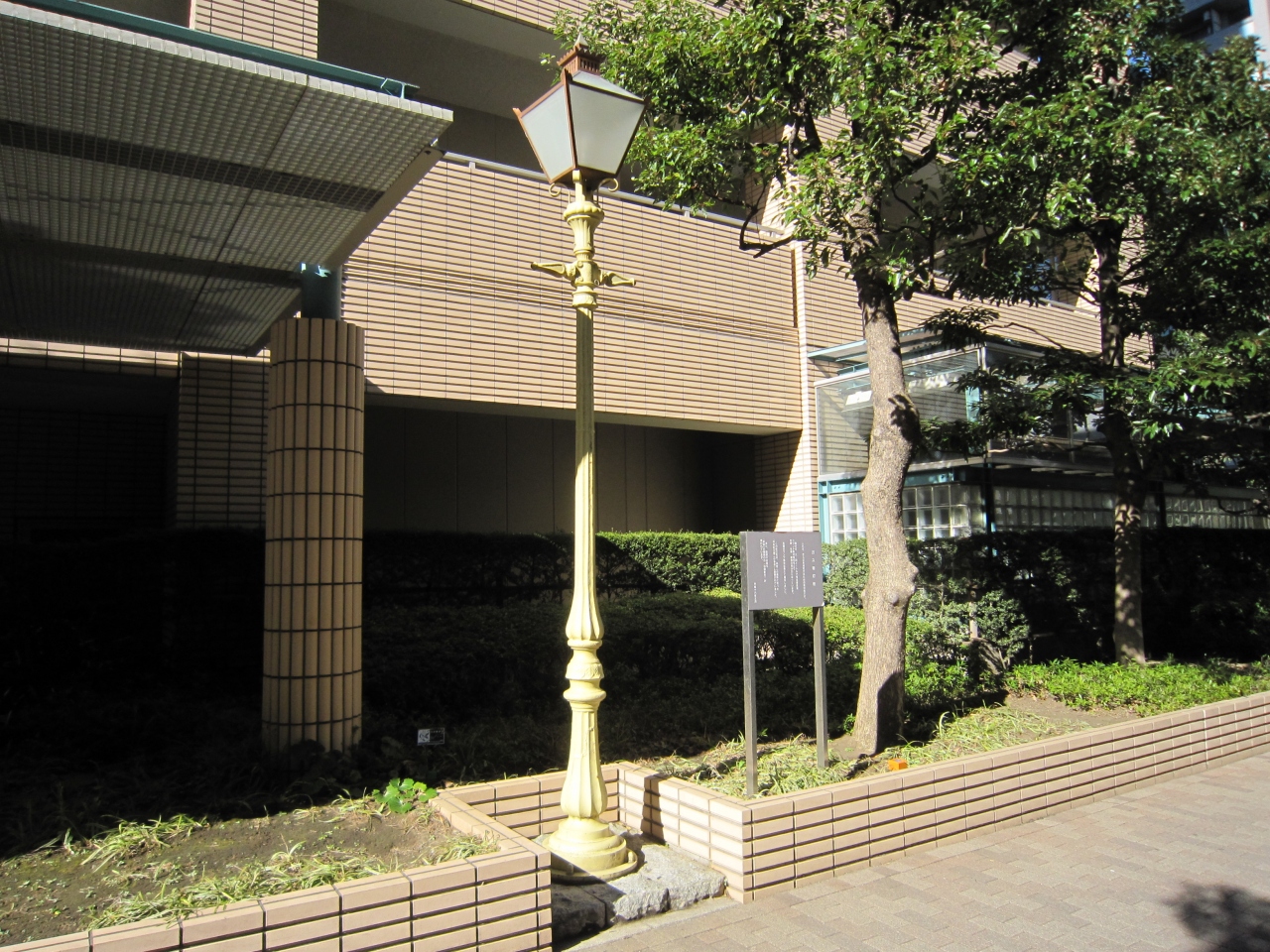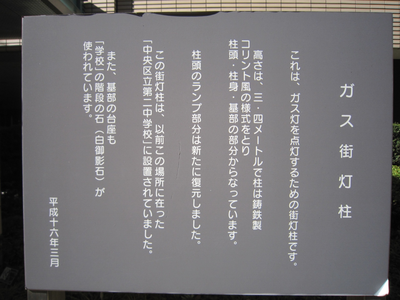 地下鉄有楽町線新富町6番出口を出て真っ直ぐ2つ目の道路を右折するとあります。居留地中央通りで中央区の生活支援施設や住宅となっている公共の建物の前、江戸バス停リハポート明石の前に説明板がありガス街灯柱が並んでいます。ガス街灯柱は以前この場所にあった中央区第二中学校に設置されていた等とあり、明石小学校の校庭の角にも築地外国人居留地跡の説明と共にガス街灯の柱の説明がありました。以前あったガス街灯柱や同時に学校の階段石の使用するなどということは物を再利用し大切にする考えでやっていると思います。街の中での懐かしく良い景観です。また街灯柱は風力発電の電力を使用しているそうで省エネも考えているようです。