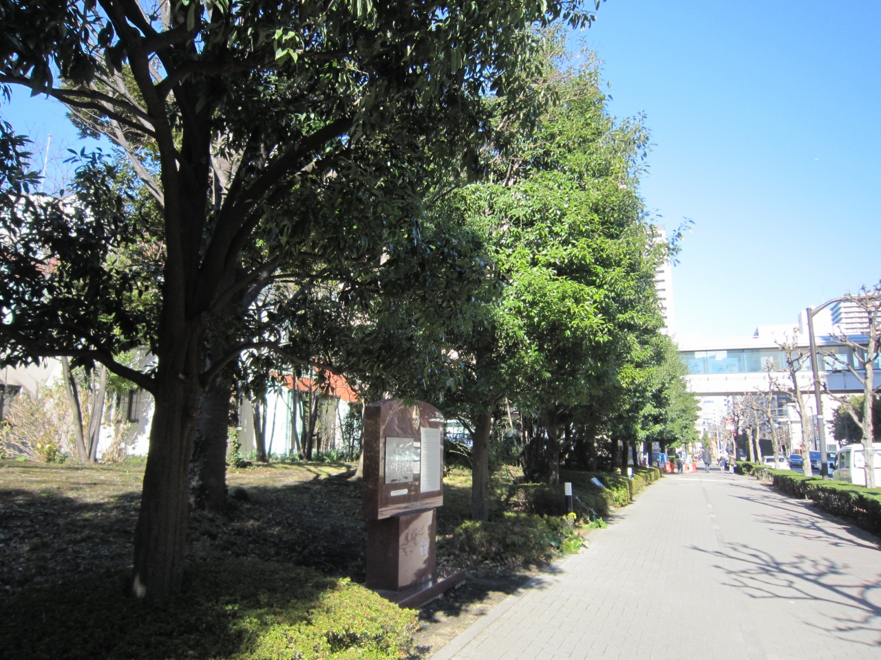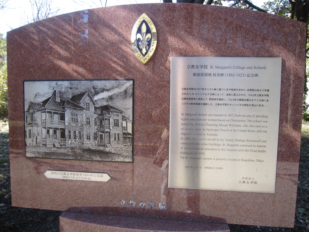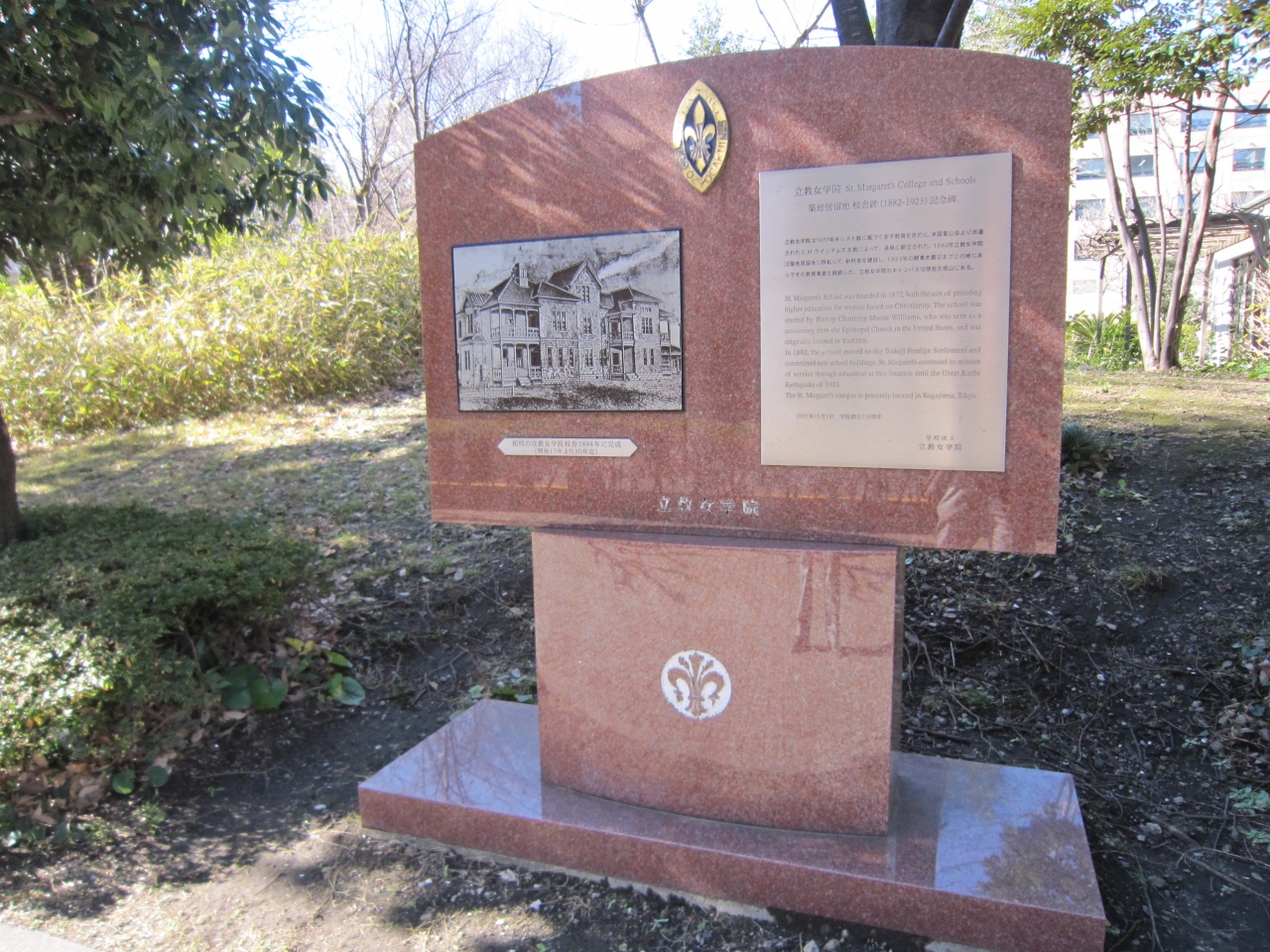 聖路加国際病院入口の道路を隔て向かい公園・公開空地の歩道側にあります。湯島に設立後、築地居留地に移転、関東大震災まであり、現在は久我山にキャンパスがあると碑に当時の校舎の絵がありました。明石小学校方面から真っ直ぐ来るとあります。人通りが多い所で立派な大きな碑ですが、あまり関心を示す通行人はないような気がします。それでも日の当たる良い場所に設置したと思います。聖路加国際病院の前ですから。歴史のある学校です。