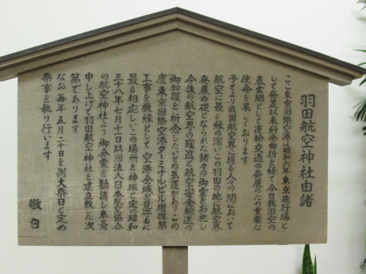 入口に由来が記されていて、空港拡張工事に伴い航空安全を祈念し、昭和38年に新橋の航空神社の分霊を祀りました。