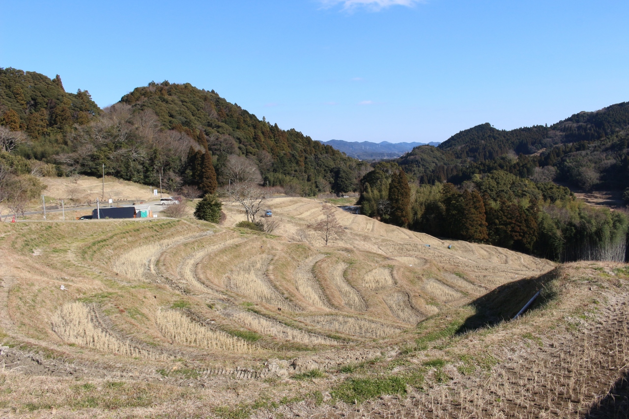 少し前から気になっていた鴨川の大山千枚田。今回、鴨川から保田へ向かう際に県道を走っていて偶然近くを通ったので寄ってみました。県道から案内の看板に従って脇道に入って山道を上っていくと到着します。冬場の枯れた田んぼでしたが、雰囲気が味わえてよかったです。秋にはライトアップされ、その時には交通規制されるそうですが、確かに山あいで道が狭いので、それも納得です。