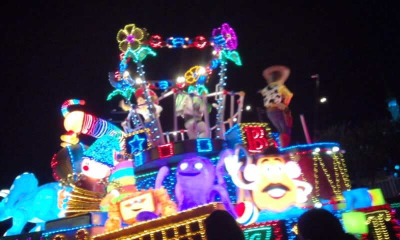 今回は4歳になったばかりのお孫ちゃんを連れていたので、エレクトリカルパレードは予定しませんでした。午後3時過ぎに退園して、念のためスタンプを受けました。また戻るとは考えていなかった。ゆっくり食事をとった後、ホテルに帰ろうとしたら、お孫ちゃんがまた行くと言い出し、エレクトリカルパレードを見ることが出来ました。いつまでも目を輝かしてキャラクターに手を振っていました。、