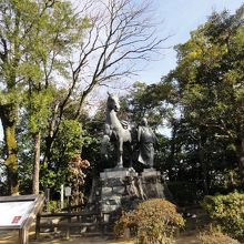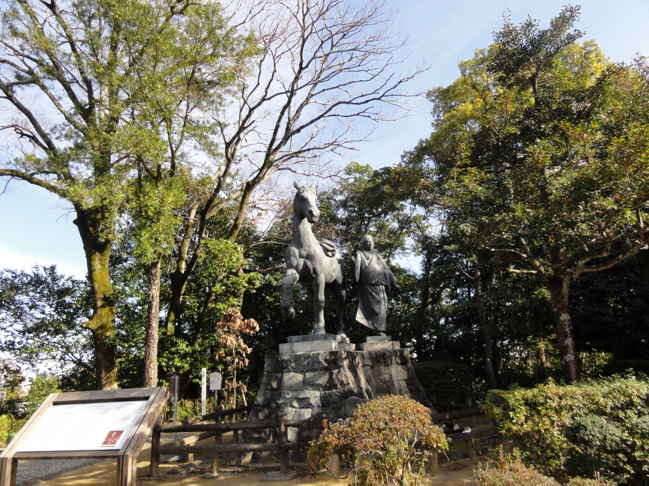 高知城を築城した山内一豊の像は追手門の外、県立図書館の横にあります。内助の功として語られる妻(千代)の像は高知城の三の丸に行く階段を上がったところにありました。像は千代だけじゃなく有名な馬も一緒です。教養高い人で政治・外交面でも一豊を支えたそうです。
