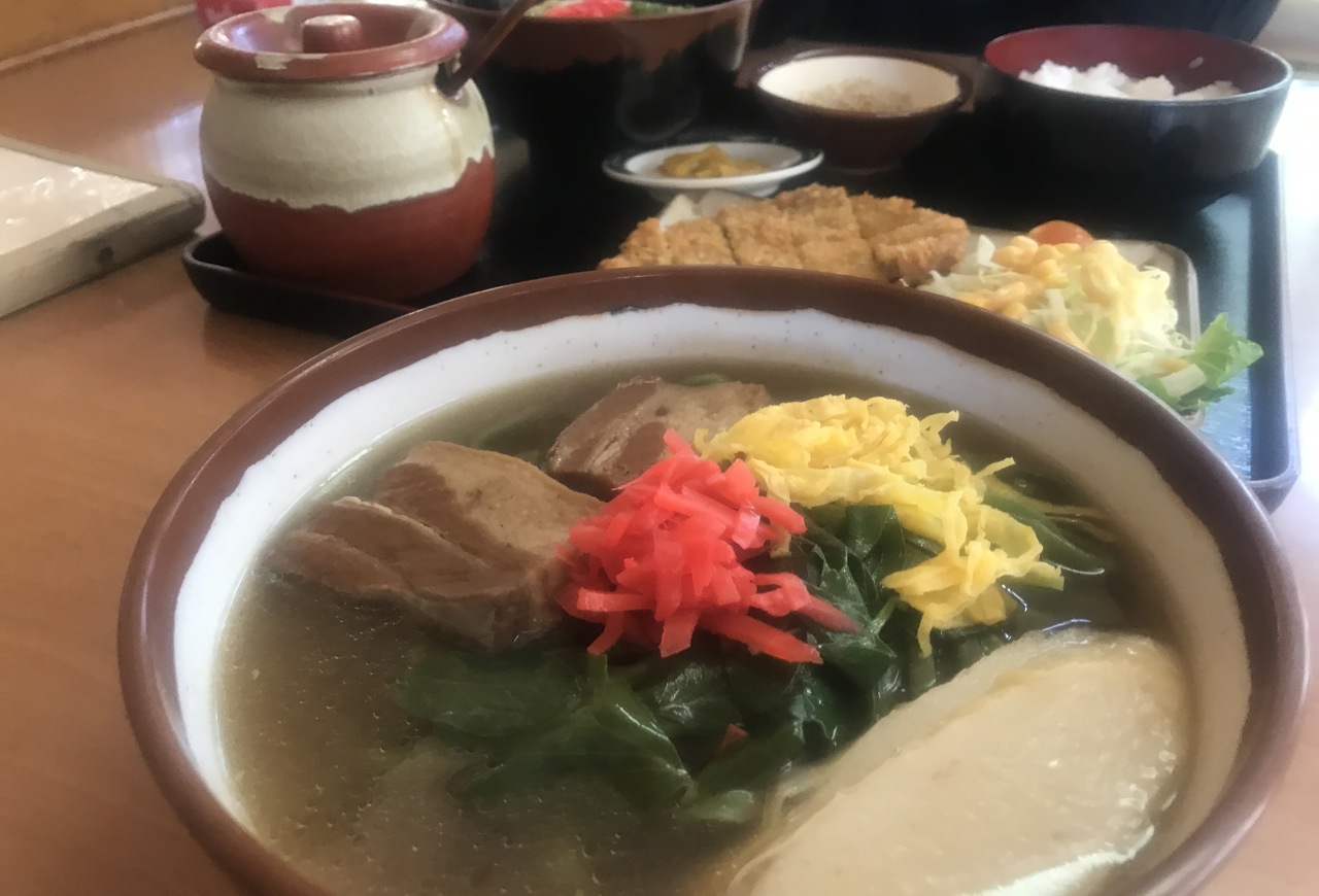 こちらは島のファミリーレストラン的な居酒屋さんです。メニュー見てるだけでも楽しめるほど、いろいろあります。今回はサクナの沖縄そばを注文。サクナ(長命草)は乗ってるだけでなく、なんと麺にも練りこまれています!癖は確かにあるけど、よもぎにも味が近く、個人的には普通の沖縄そばより好きかな。