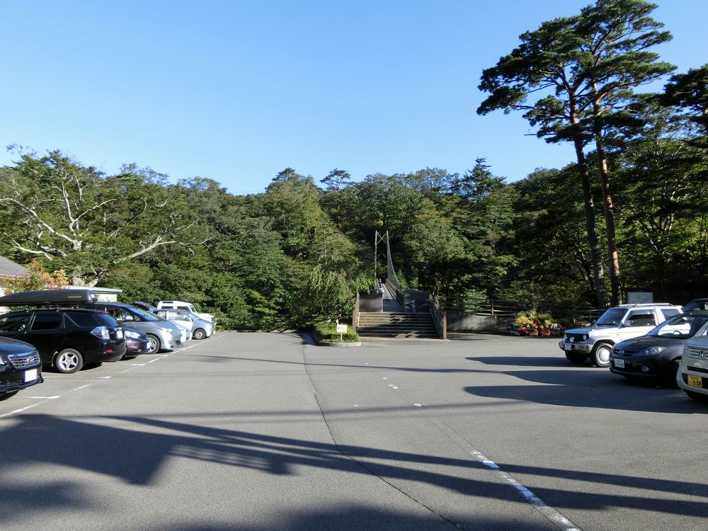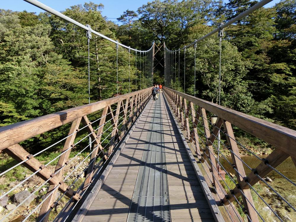 この吊橋は結構しっかりした造りであまり揺れないため、吊橋としては物足りないですが、橋の上からの景色は良好です。箒川と山の自然豊かな景色が広がります。足元の真ん中部分が金網になっているので下が見えておもしろいです。ただし、川面からの高さはそんなに高くなく、むしろ川の流れがよく見えました。駐車場の一画には無料の足湯があるので、休憩がてら寄ってみるのもおすすめです。