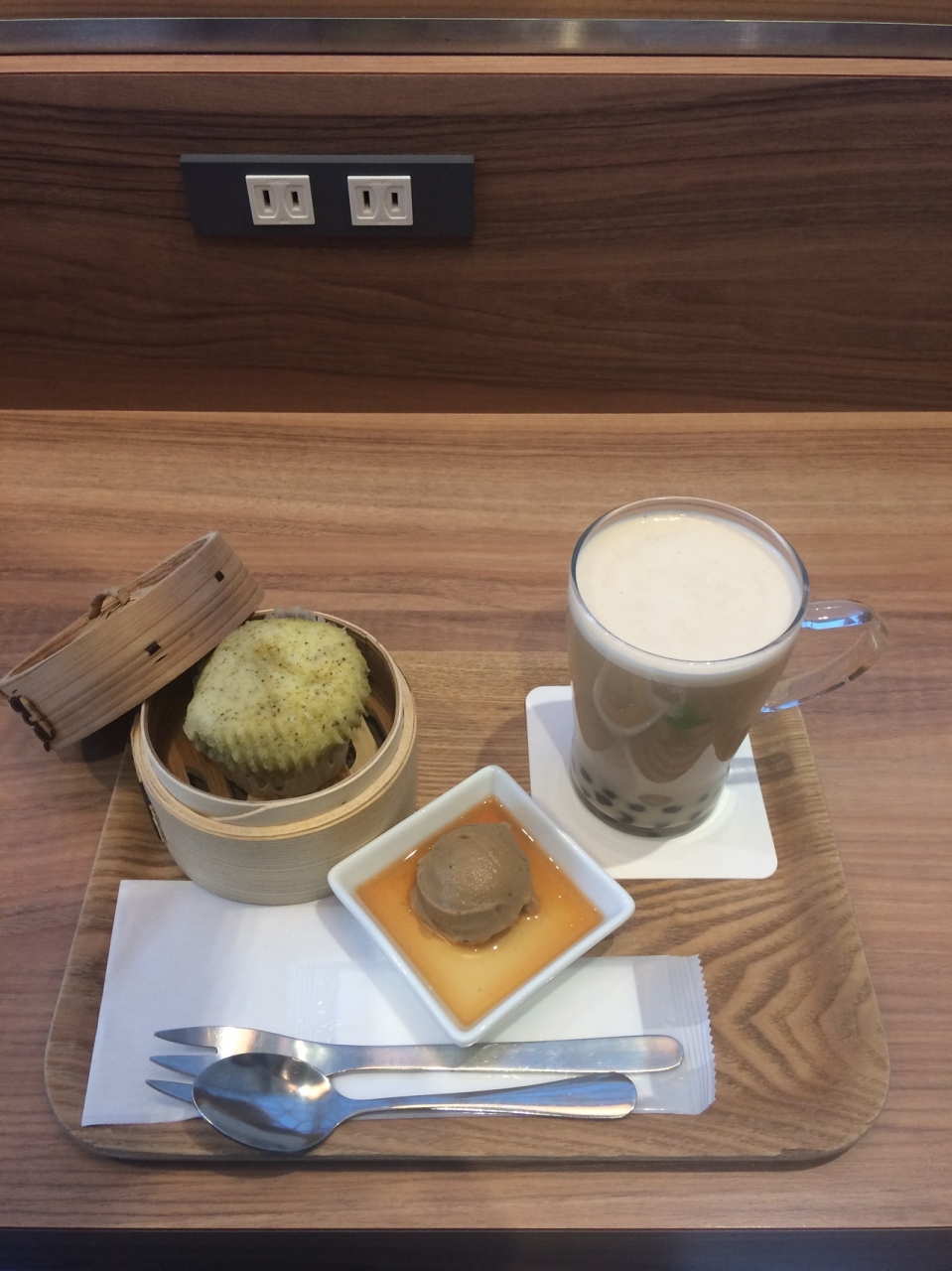 ホットタピオカミルクティと台湾風蒸しケーキ(四季春茶のケーキと紅茶のクリーム)を頂ききました。どちらも甘すぎずに程よい感じです。