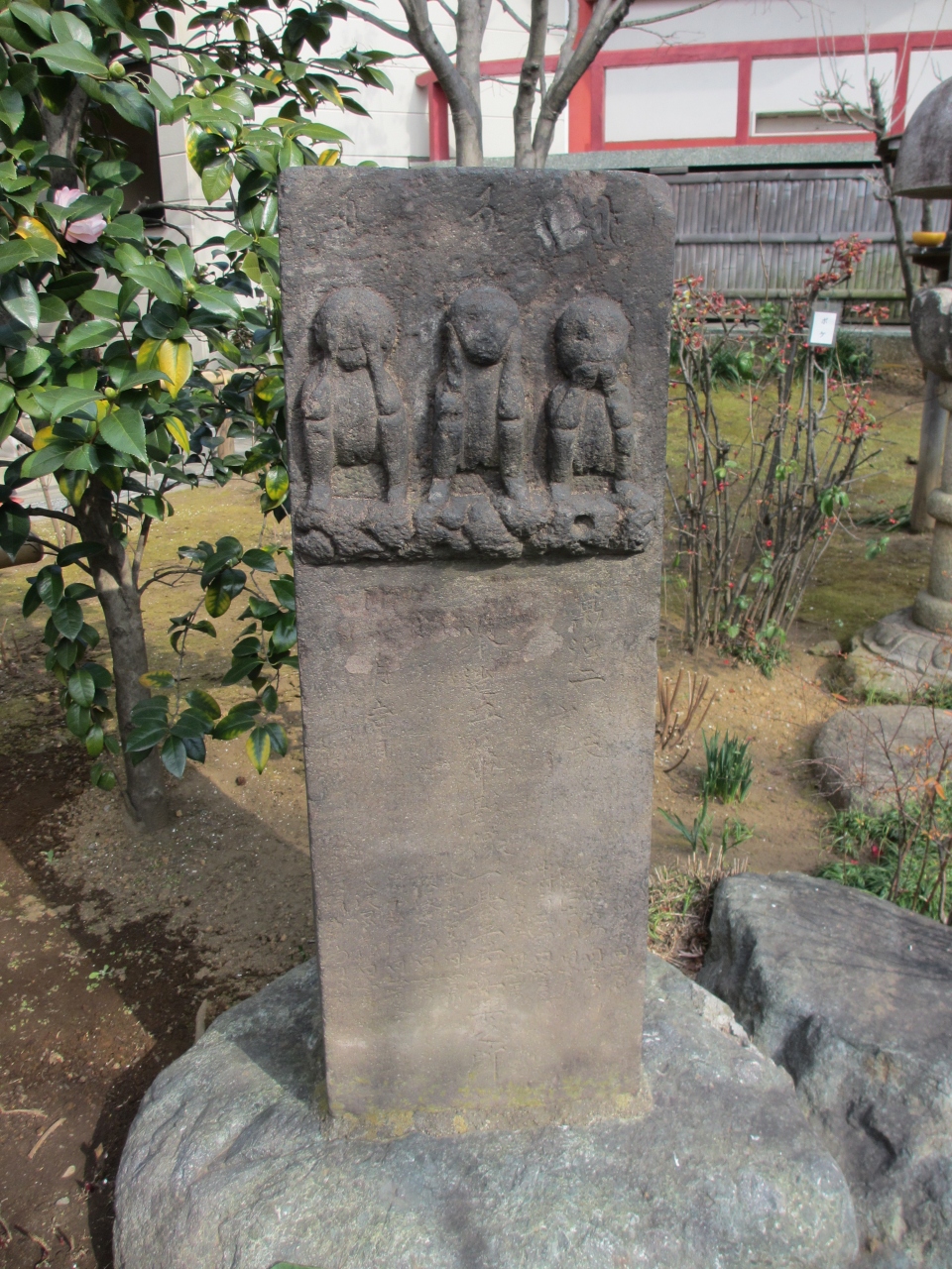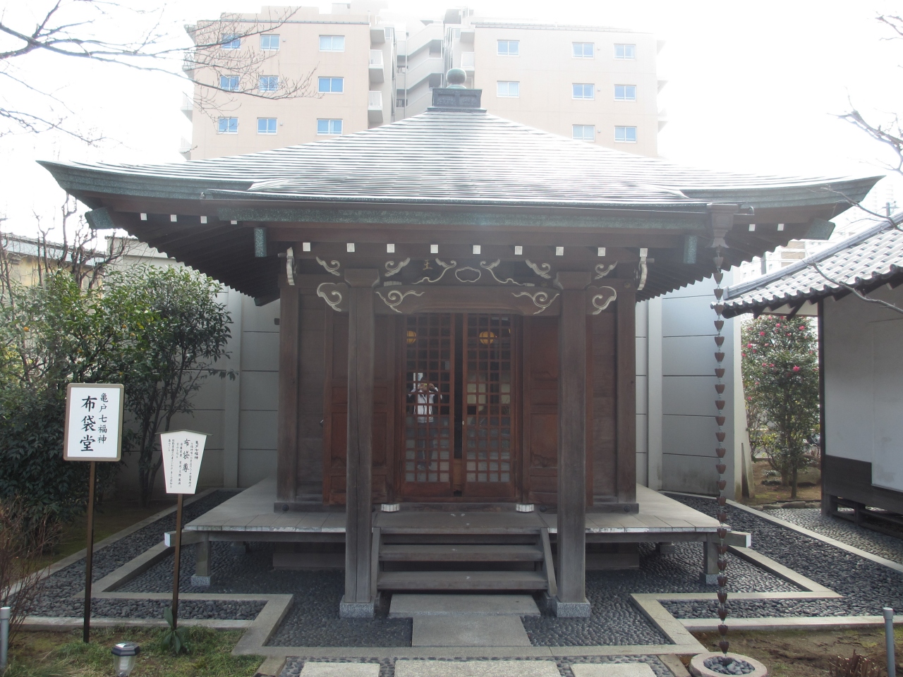 亀戸天神社の北側、横十間川沿いの天台宗寺院です。山門をよく見ると塀が歌碑になっています。境内のいたるところに句碑や歌碑が置かれています。奥に建っている本堂は赤い八角堂で、本堂前の庭園に河津桜が咲き始めていました。三猿が彫られている江東区内最古の庚申塔は庫裏前にあります。地蔵堂、布袋堂、不動堂が境内にあり、扉が少し開いていてにこやかな布袋尊、厳しい不動明王を見ることができました。手入れされた木々と石の庭園や美しい鯉が泳ぐ池のある庭園があり気持ちが穏やかになる寺院です。歌碑・句碑が点在する庭園がおすすめです。