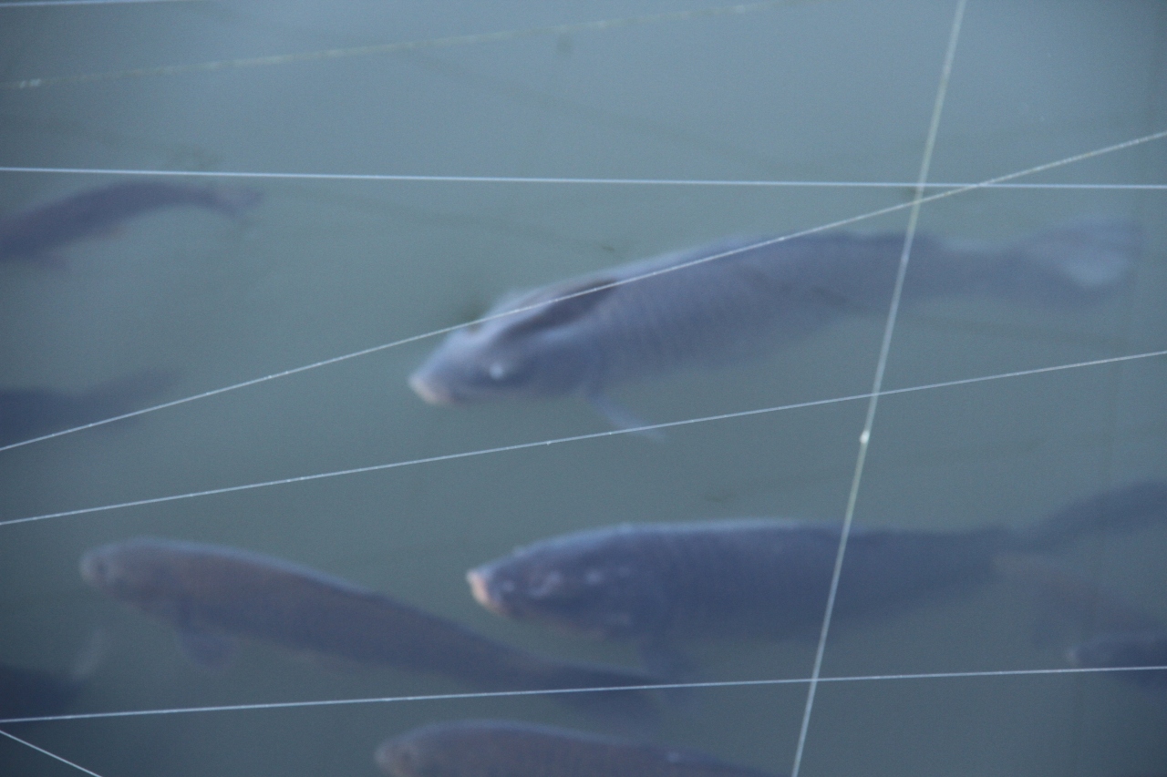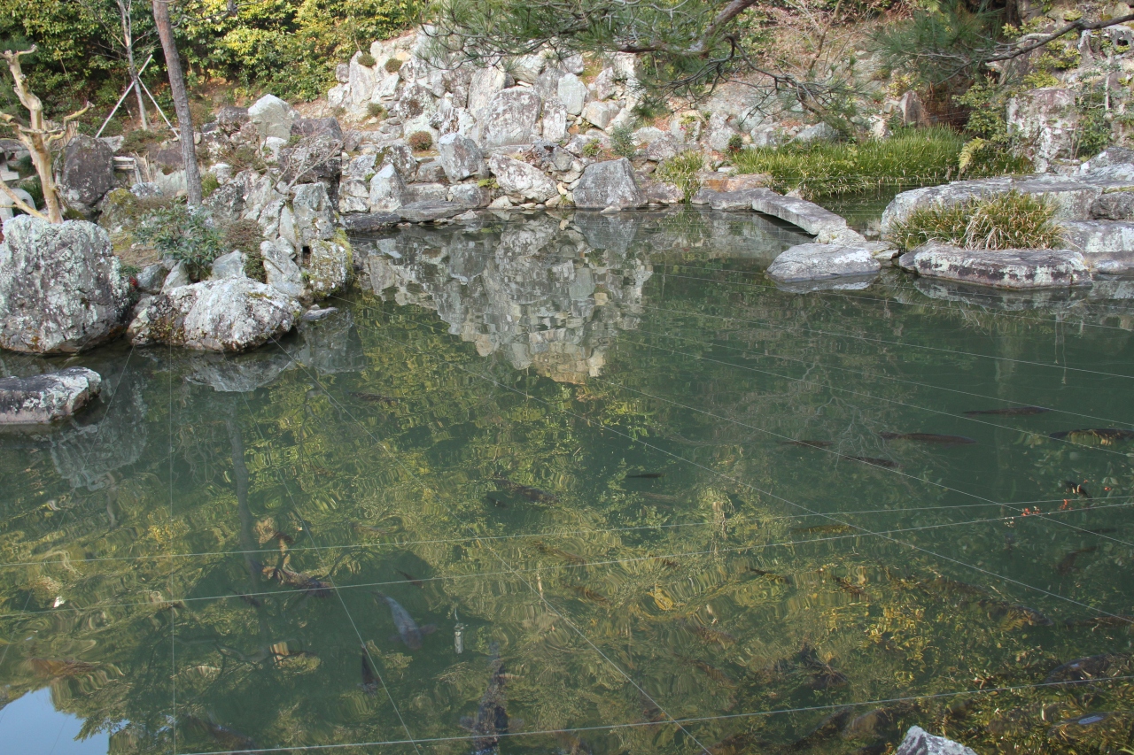 池の上にはナイロンの糸なのでしょうか何層にも張り巡らせています。
