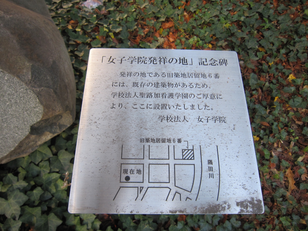 聖ルカ通りの聖路加国際大学への入口右横、聖路加国際病院方面、大きな石を削り公園・公開空地の歩道側に設置してあります。ただ、発祥の地はやや離れており、既存の建物があるためこの地に設置したと説明板がありました。この聖ルカ通りは人通りが多いですが、樹木の中、向かいの建物の影で暗くあまり気が付く通行人はいないようです。明治時代前後にこの近辺には多くの学校が出来たことを改めて感じました。