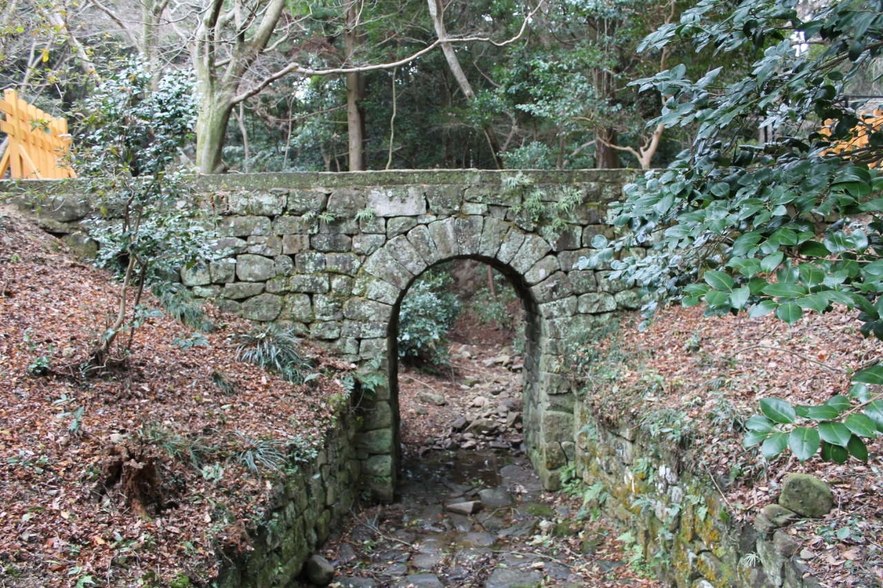 大麻比古神社の裏に作られた石組みのアーチ橋。規模は驚くほど小さいです。製作者はドイツ人捕虜が池を作り、故郷を偲んで石造りのアーチ橋を作ったとのこと。