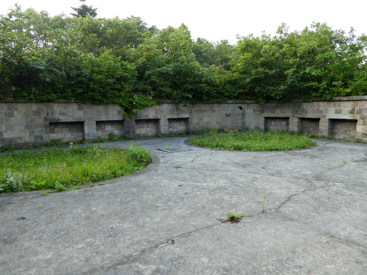 砲台は3つの部分に分かれており、各部には2つの丸い草地が並んでいます。この丸い部分はまるで荒れ果てた花壇のようですが、回転式の砲塔が撤去された跡だと推測します。