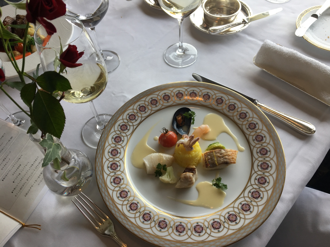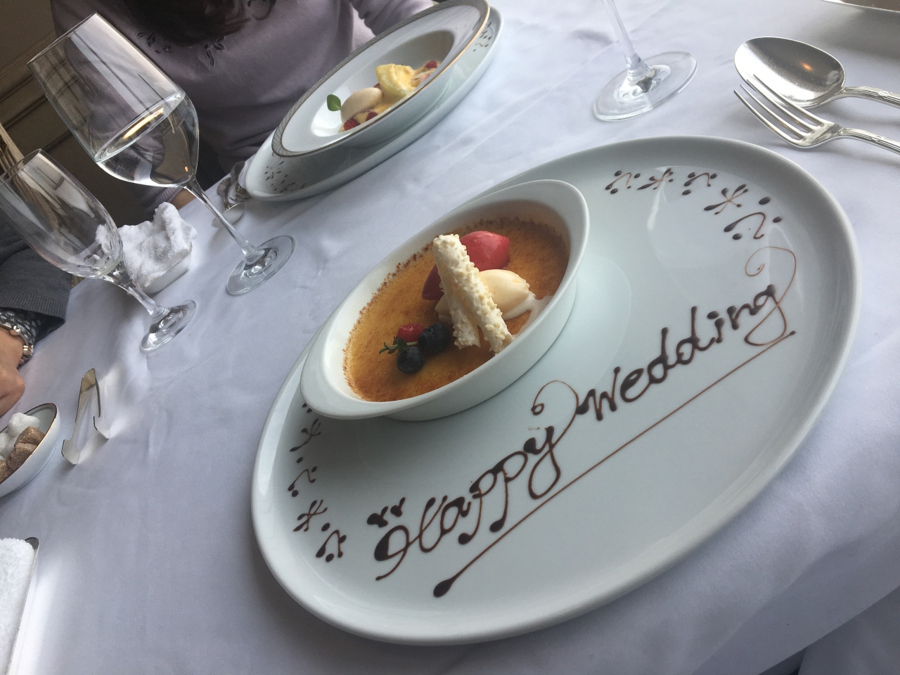 この日は 息子と婚約者が指輪を受け取りに行くと言うので 私と主人もお邪魔虫ですが同行しました。せっかくなので スペシャルランチにしようと 予約もしていなかったのですが こちらに伺いました。 数分でお席を用意していただいて、たぶん?!ソムリエの方が とても親切にしてくださいました。 写真も上級者の腕前で素敵な写真の撮り方なども教えてくださり、また その写真を帰るときまでに用意してプレゼントしてくれました。デザートも 息子たちのプレートにHappyWeddingの文字がチョコレートでDecorationしてあって 感動しました!! 当然 お料理やワインもとてもすばらしいものでした。