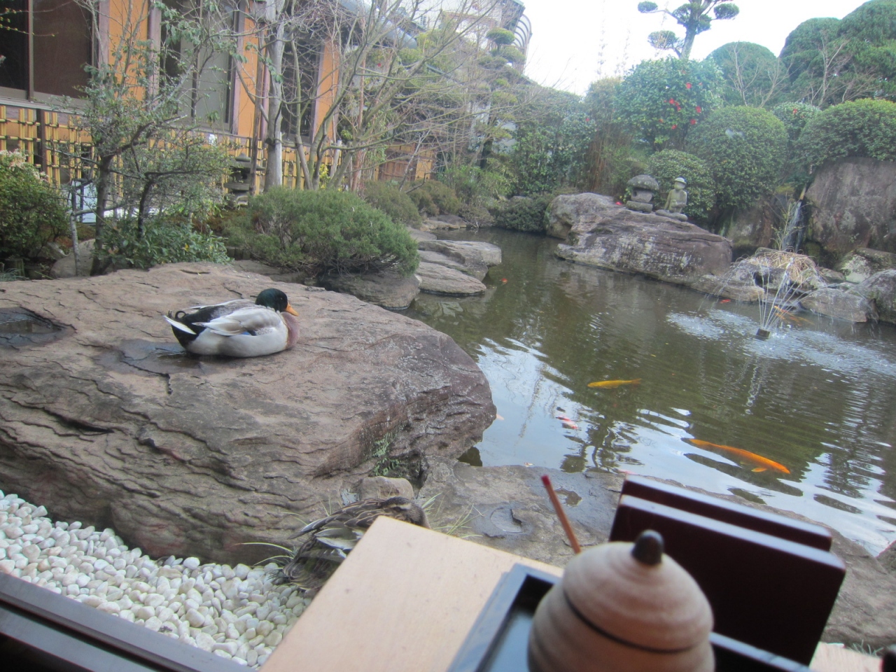 ここは席次第ではお庭のオシドリ夫婦を眺めることができ、お食事が来るまでの間楽しむことができます。