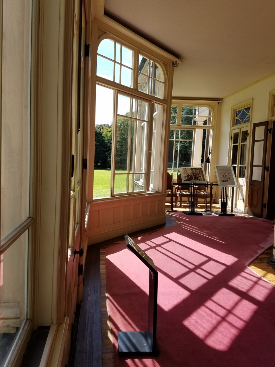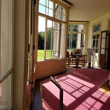 木漏れ日が差し込む廊下から見える美しい芝生と青い空のコントラストも非常に美しく建築のすばらしさとともにひとつの見どころといえます。