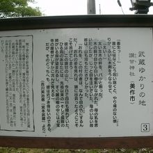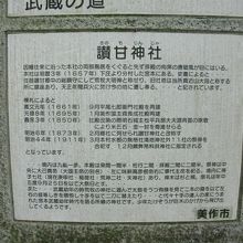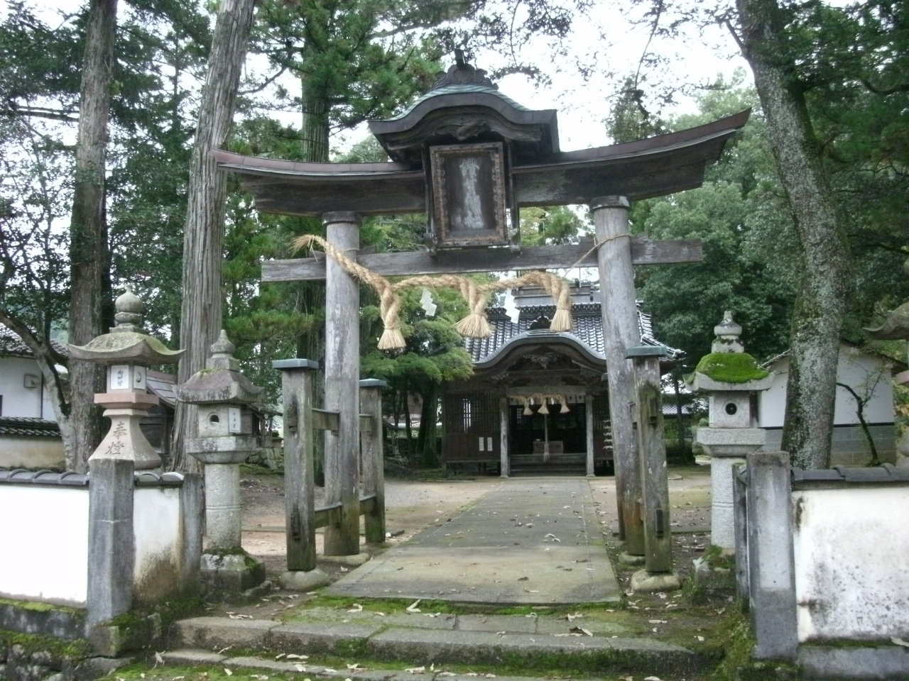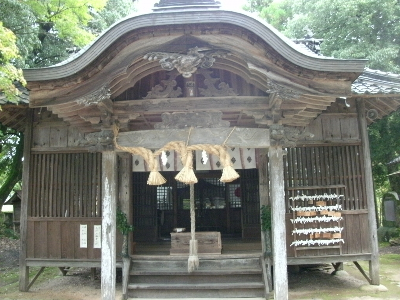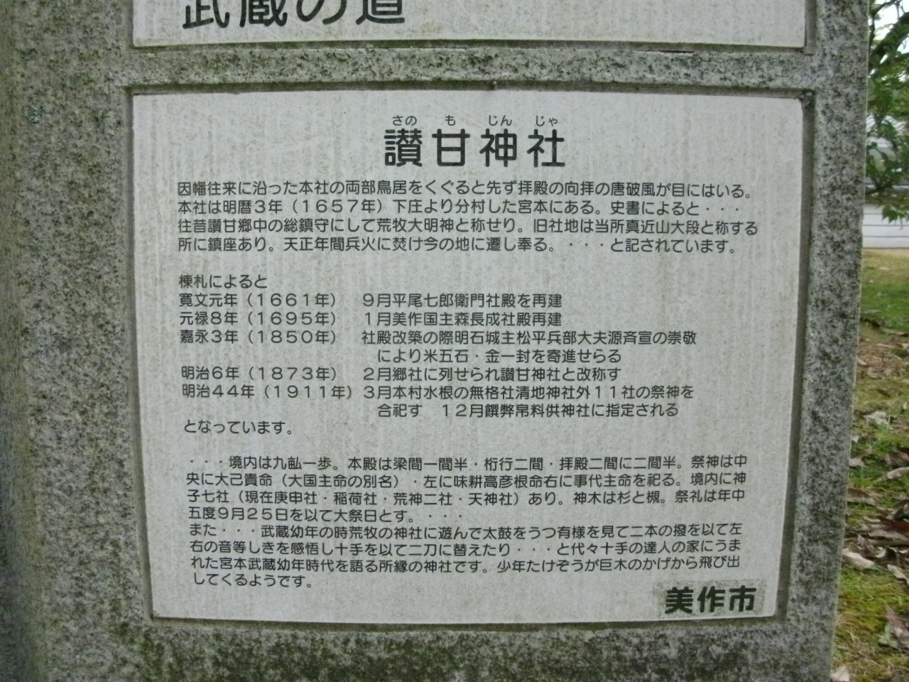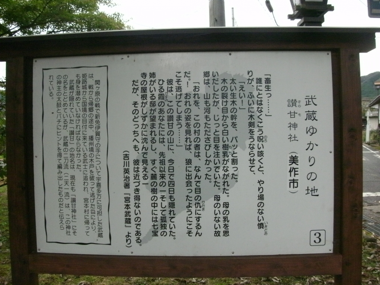 宮本武蔵の生家跡のとなりにある武蔵ゆかりの神社です。現地にある由来書きには、宮本武蔵が幼年の時に当神社の太鼓をうつ二本のバチの音が左右の均等であったことから、二刀流を思いついたと言う意味のことが記されていました。小さな神社ですが、歴史を感じる風格がある神社でした。