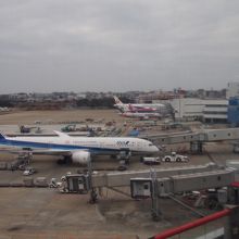 福岡空港の国内線ターミナルの4階に展望台があり、その上に展望室があります。寒い今の時期は展望室の方がゆっくりと落ち着いて滑走路などが見えます。福岡空港は国内基幹空港なので多くの飛行機の離発着がみられます。またANA、JAL以外の航空会社の飛行も多くみられるところがいい点です。平日の昼過ぎでしたが、多くの人が展望台から飛行機を見ていました。