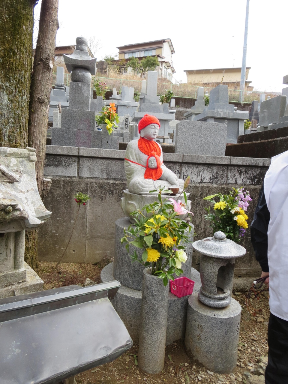 以前は、大師堂の梅の木の下で、梅を見上げてらっしゃったので「梅見地蔵さま」という名前になったそうです。