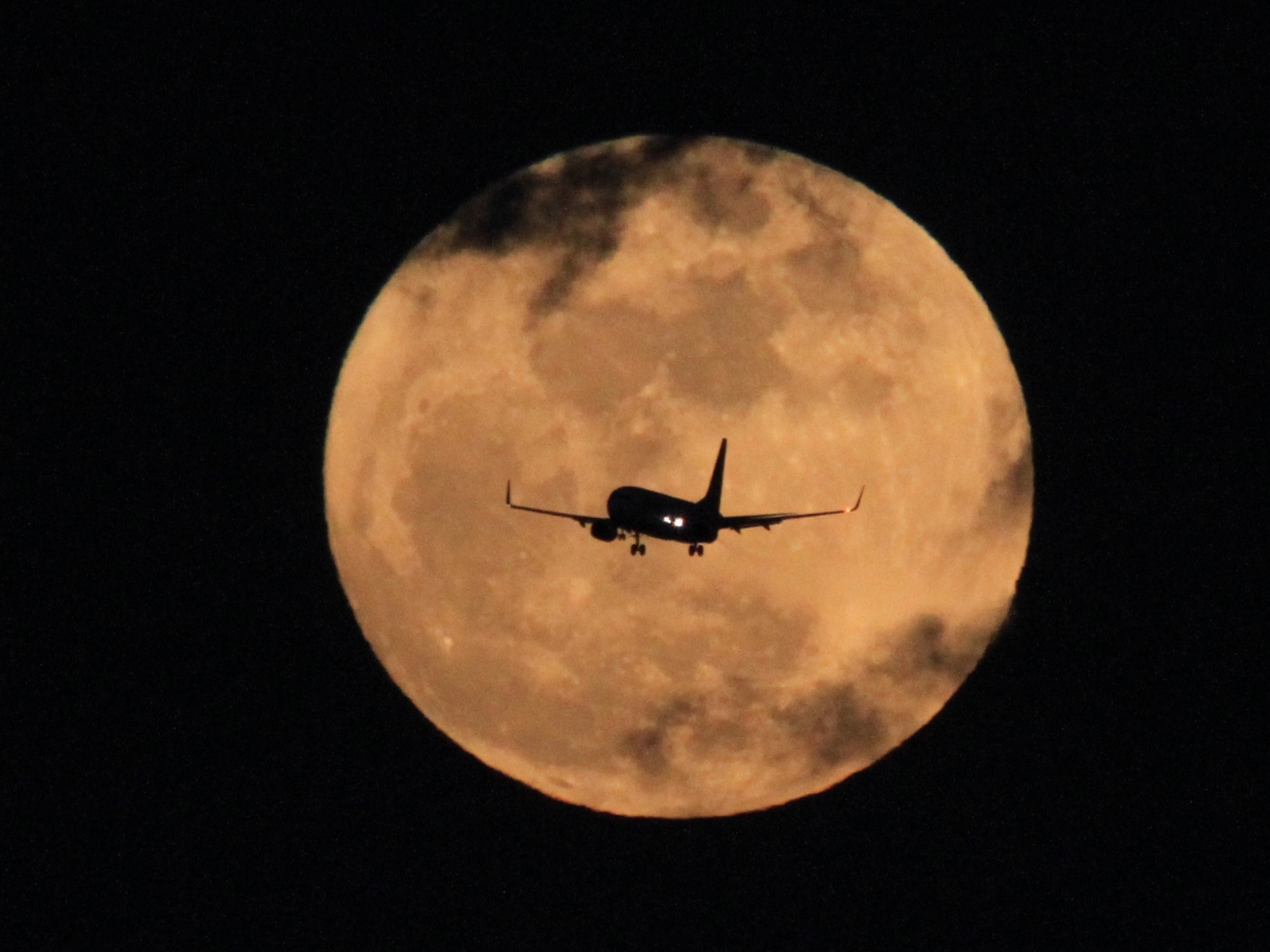 満月の夕方、月を眺めていると、飛行機が月の中を通って行きますよ。