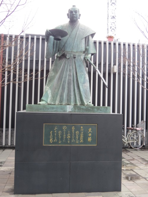 博多駅の博多口にある銅像です。母里太兵衛と思われる人物が大きな杯と槍(日本号?)を手にした像で、台座には黒田節の歌詞が書かれています。広場の端の方にあり、像自体あまり大きくはないので、そんなに目立ちはしませんがそこそこ待ち合わせ場所に使われているようでした。