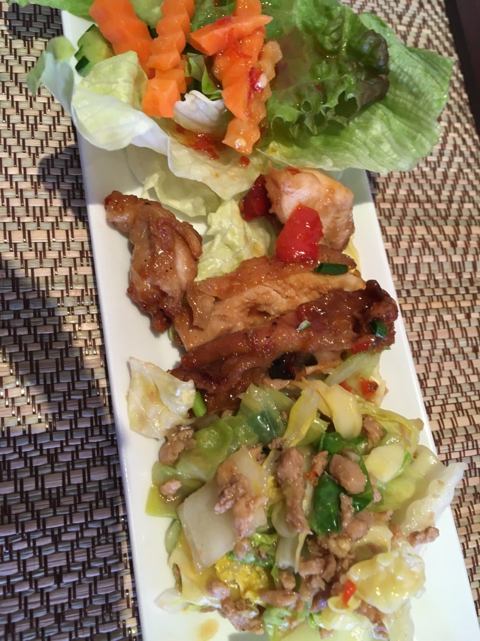 ビュッフェスタイルの前菜があり、スープ、サラダ、炒め物と飲み物、タピオカココナッツミルクがありました。