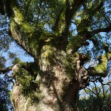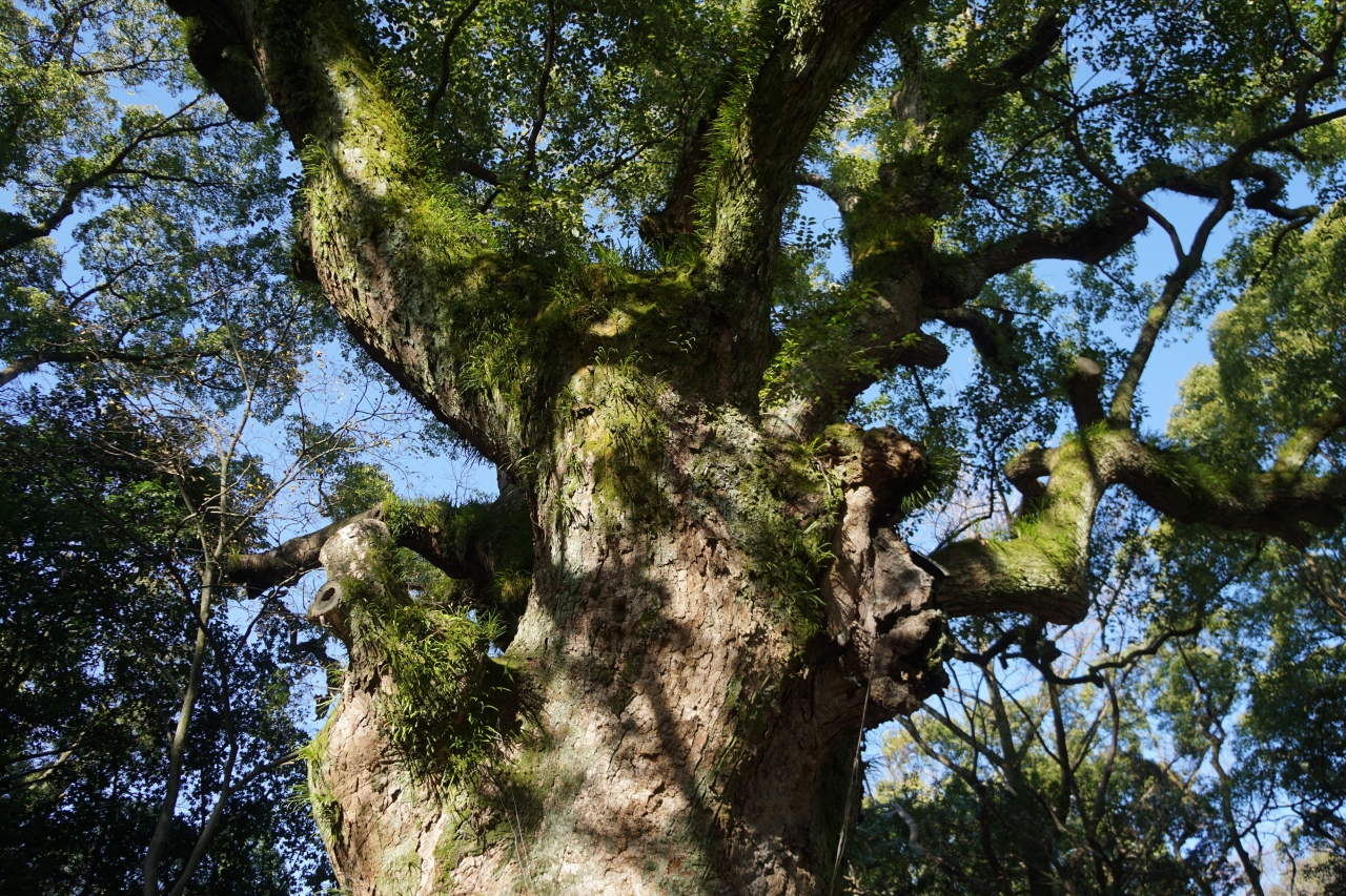 熱田神宮の大楠は、手水舎から本殿に向かってすぐ。神木として回りに囲いもあるので、すぐにそれと分かります。ちなみに、熱田神宮の境内には大楠は7本あって、この大楠は3番目の大きさのようですが、それでも雲を突くような迫力。途中で二股に分かれていますが、それぞれが力強い幹となって延びています。