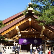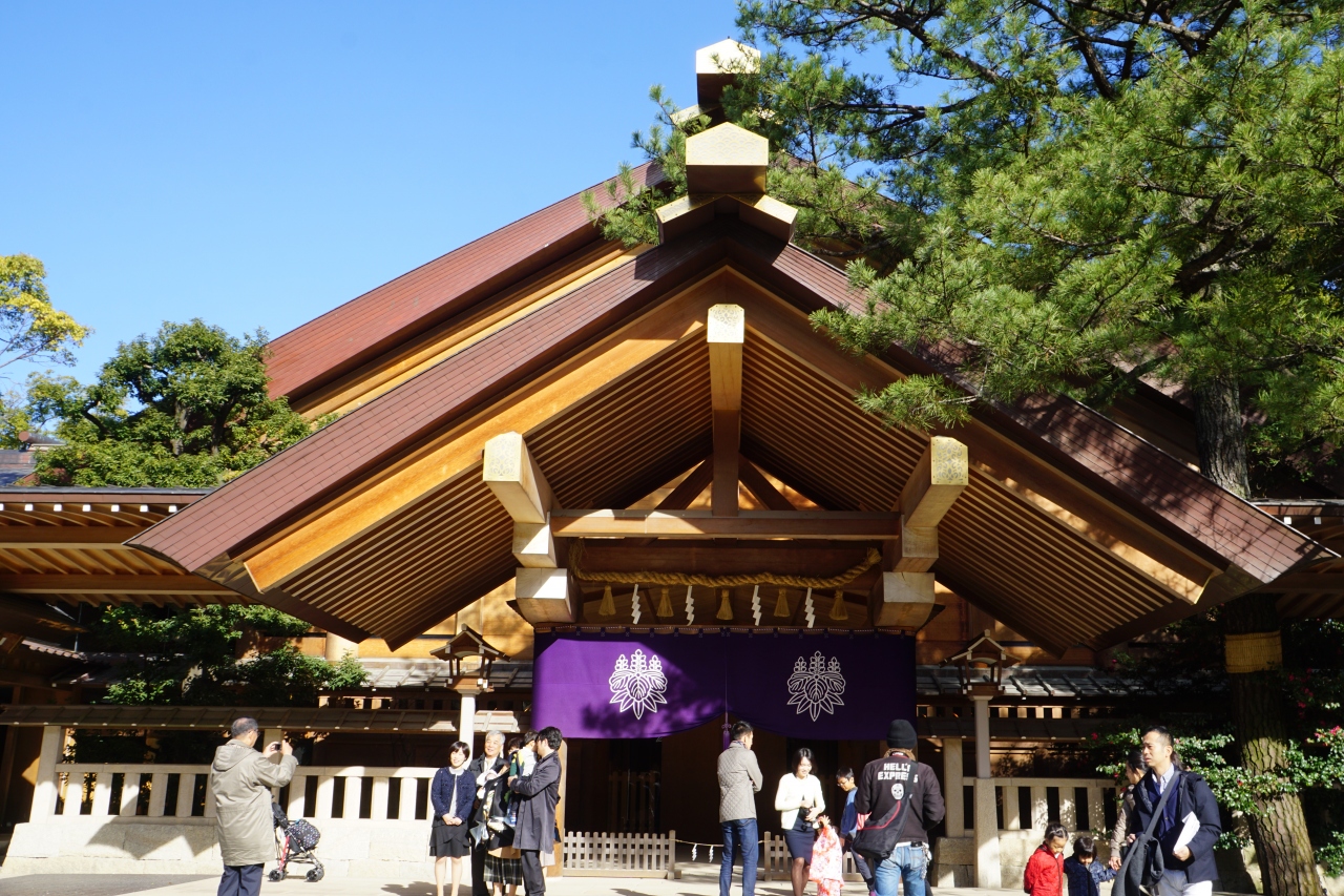 熱田神宮の神楽殿は、本殿に向かって、右手の方。大きさもありますが、まだ真新しいような建物で、全体がキラキラ輝いているような感じです。初宮参りや安産などの祈祷を行う場。赤ちゃんを連れたご夫婦とかの姿も見えました。