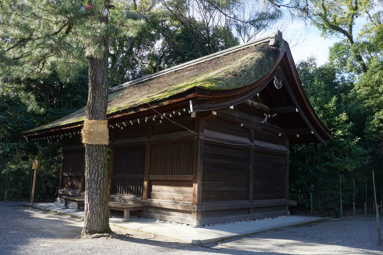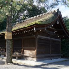 熱田神宮の西楽所は、神楽殿の向かいに建つ桧皮葺の風情ある建物。将軍綱吉の再建なので江戸時代の建物でしょうが、もっと古い感じがするように思います。