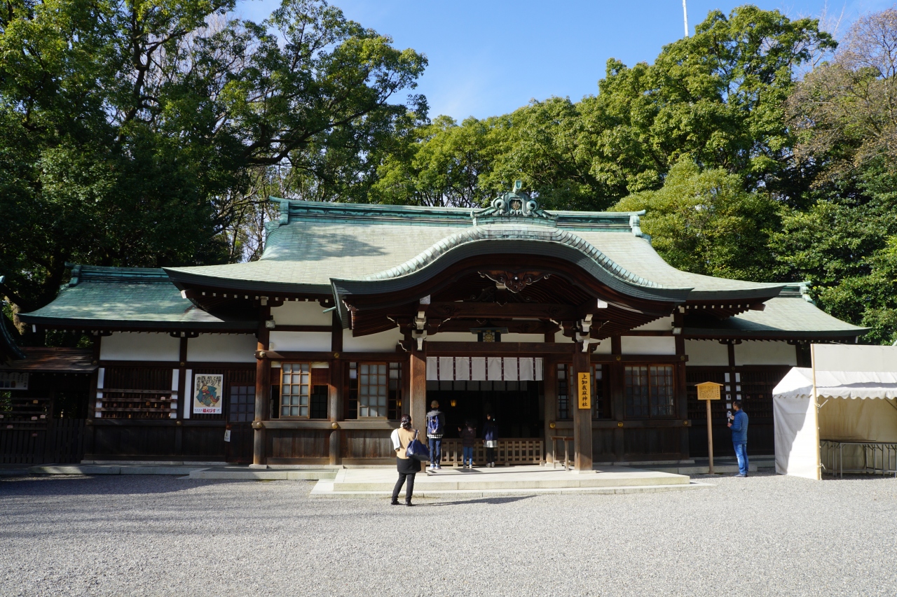 上知我麻神社は、熱田神宮境内の南側。正門を入ってすぐ左手に向かった開けた場所に建っていて、下知我麻神社とはちょっと好対照だと思います。