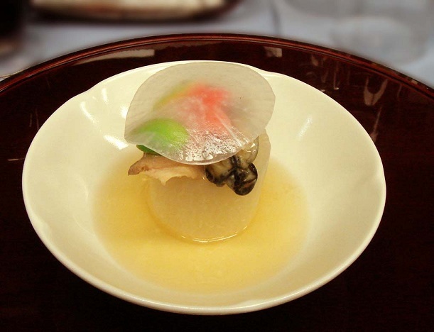 写真は薄味に炊いた大根ですが、透けた感じで見えるもみじ型の人参がきれいです。日本食に慣れていない人にお出しするには、活きの良いお造りもいいかもしれないけど、こういうちょっと凝ったお料理がいいかな、と思います。