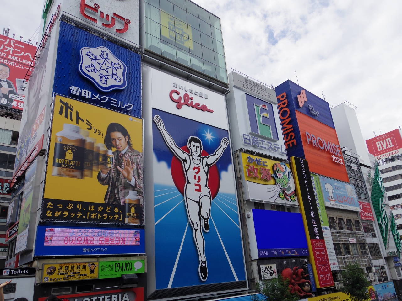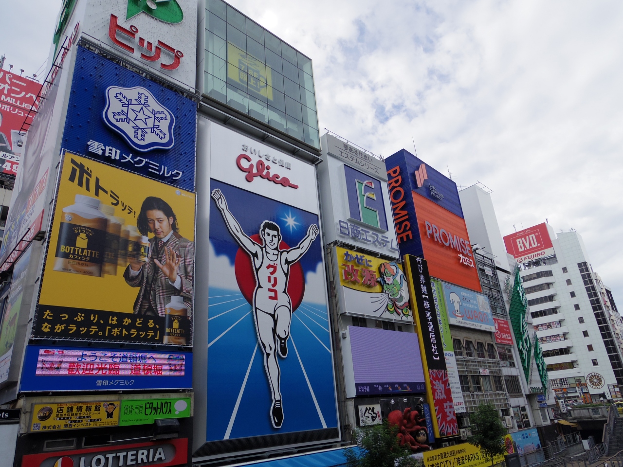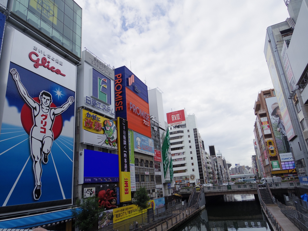 道頓堀川にかかる戎橋から、昼夜を問わず、多くの観光客が記念撮影をしています。