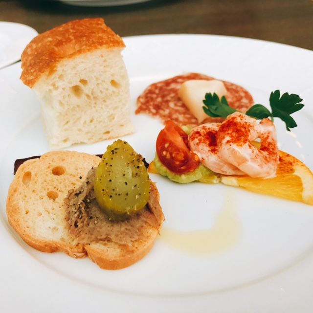 前菜はパン、ハム、ブルスゲッタなどの盛り合わせ