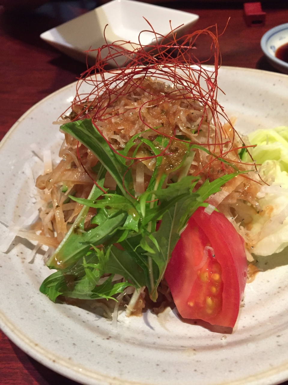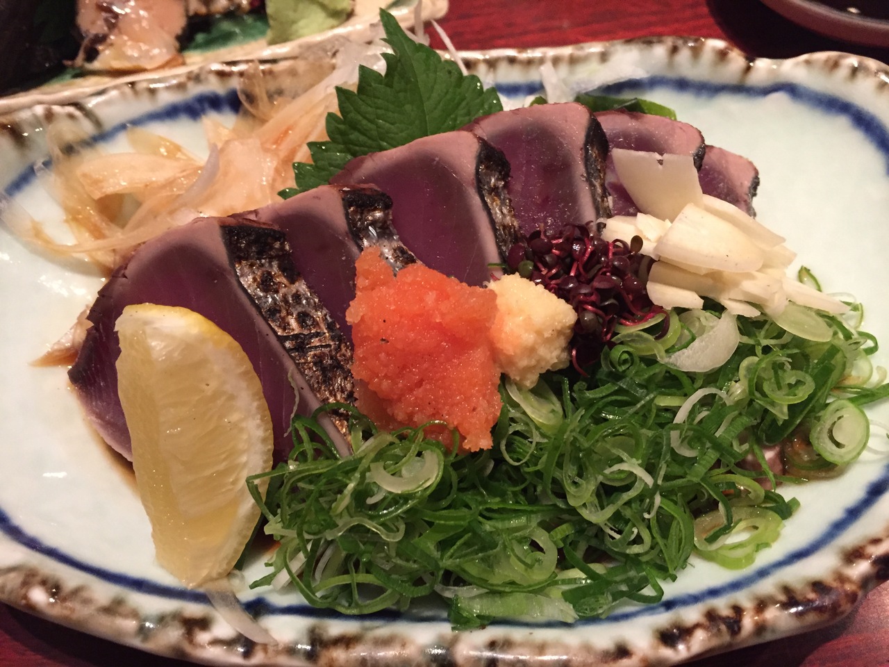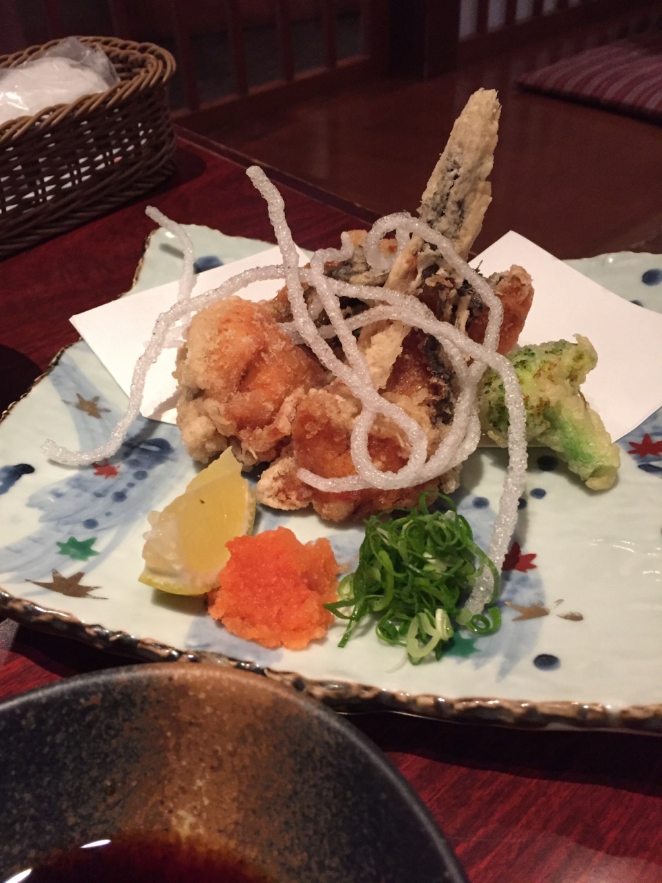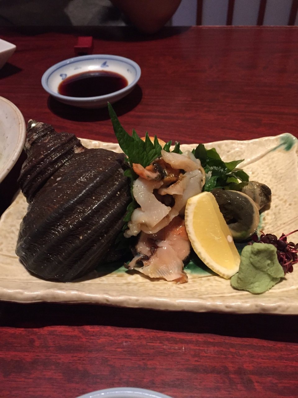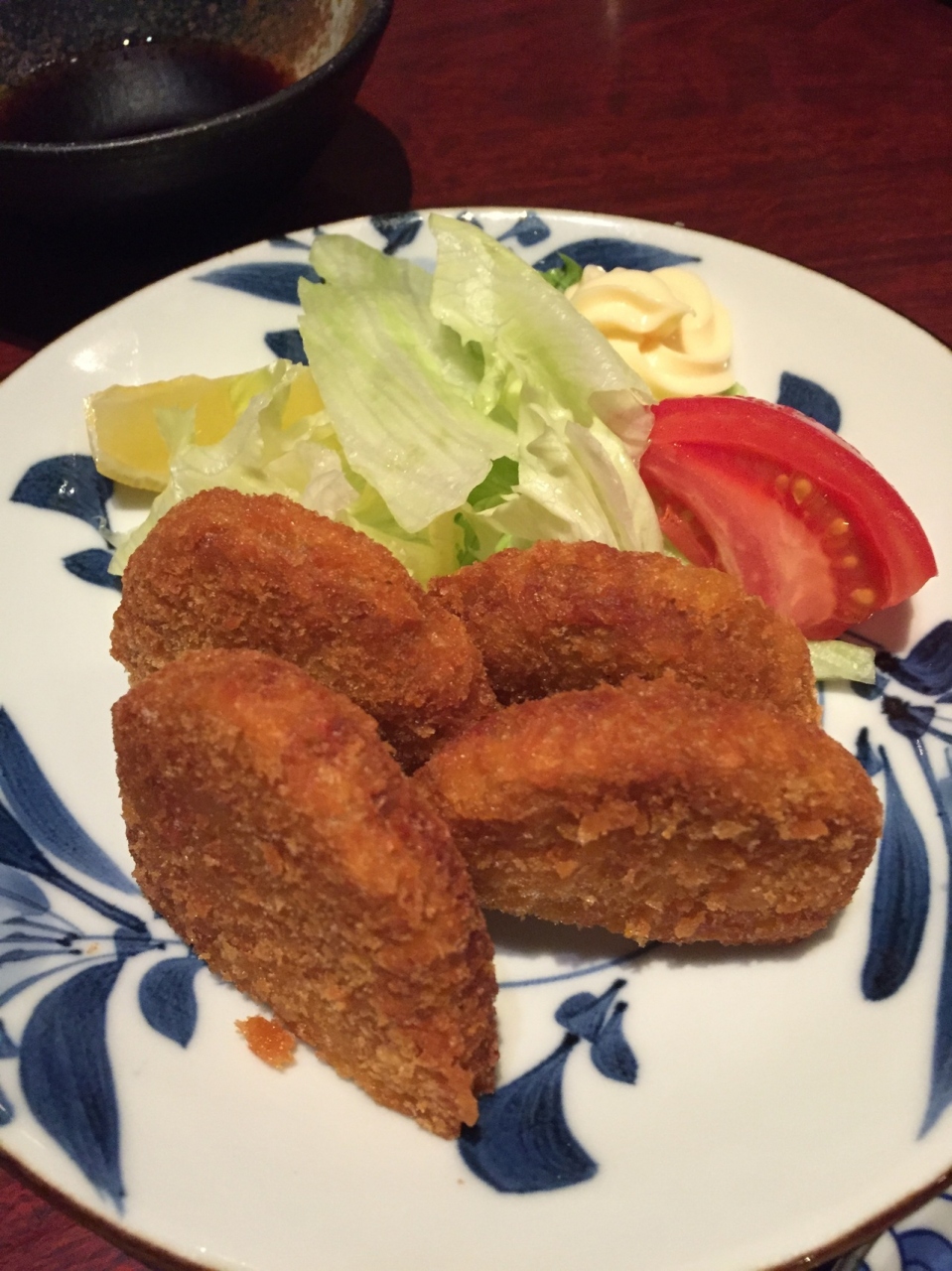 郷土料理をいただけて遅い時間まで営業しているお店です。掘りごたつになっています。入り口に入って正面の小上がりに座りました。その部屋はテーブルが4つほどありました。1人で食事されている方が2組いました。ピンポン手押しボタンで店員が来てくれます。