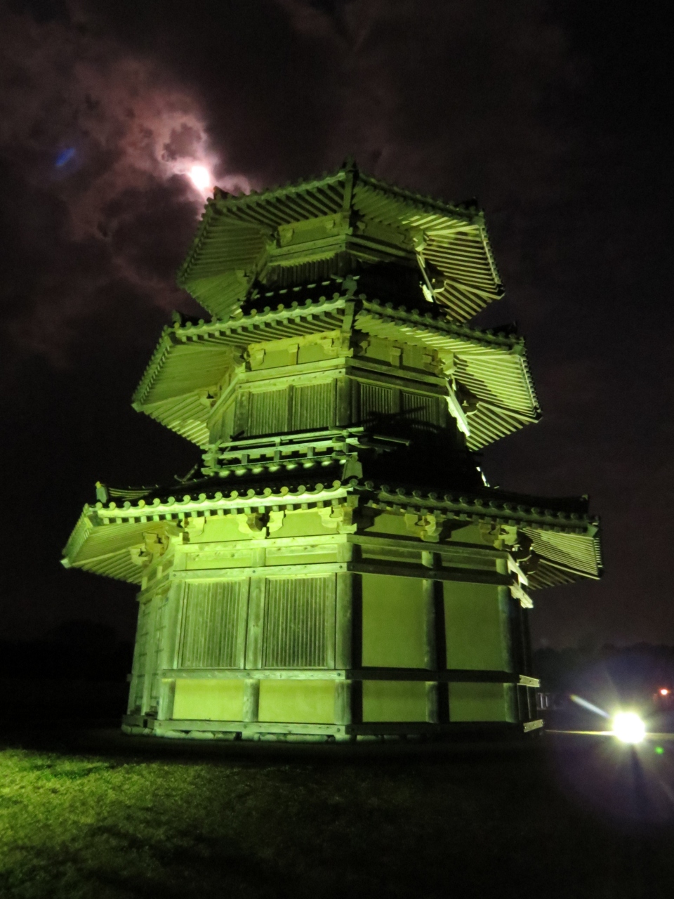 鞠智城は白村江の戦いでの大敗北のあと、新羅と唐の連合軍による報復を恐れて造られた古代山城の一つだと考えられています。訪問時は、すっかり日が暮れて辺りは真っ暗闇になっていました。その闇の中、発掘された礎石をもとに復元された八角形建物や校倉造の倉庫などの建物がライトアップされていました。城域を回るのは危険だったので、それらの建物の外観を見学するのみとなりました。機会があれば、また訪れてみたいです。
