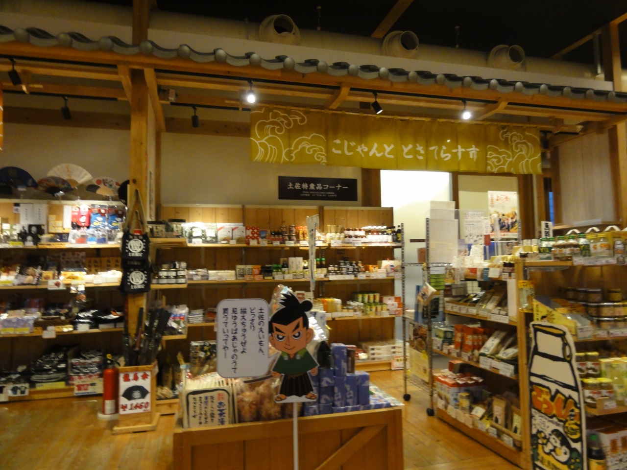 ガイドブックで紹介のお土産がすぐ見つかる売店でした。馬路村のポン酢は数年前から愛用してたので、柚子商品見るのが楽しみでした。空港にあるかなと思いつつもジュースと柚子塩ポン酢購入、ジュースはその場で飲みました。龍馬グッズ、ミレービスケットや銘菓のかんざし、土佐日記の他、高知県以外の商品もあります。