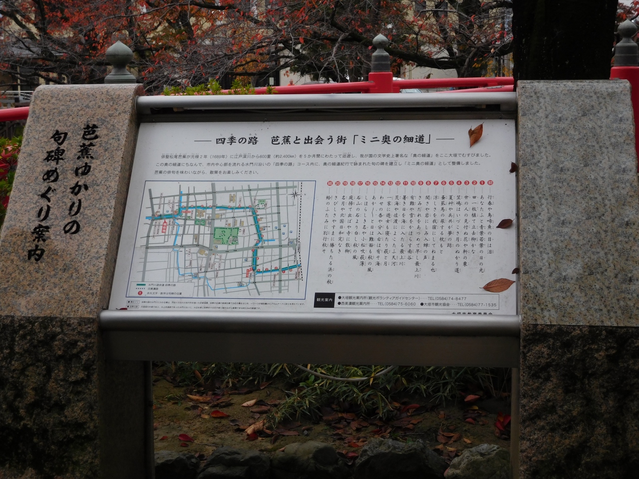 全国水の郷100選に選ばれた水の郷「大垣市」を流れる「水門川」沿いに、綺麗に整備された遊歩道です。川沿いには木が生い茂り、松尾芭蕉が奥の細道紀行で詠んだ句の碑が置かれているので、俳句を詠みながら(探しながら)のんびりと散策をする事が出来ます。ちょうど紅葉のシーズンであった為、川沿いの木々が紅葉してとても綺麗でした。時間があれば、もっとゆっくり長い距離を散策してみたかったです。