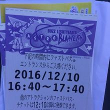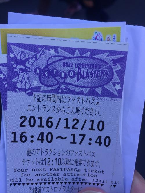 あさイチのファストパスはモンスターズインク、その2時間後にバズライトイヤーでも16:40-17:40のチケットとれました。