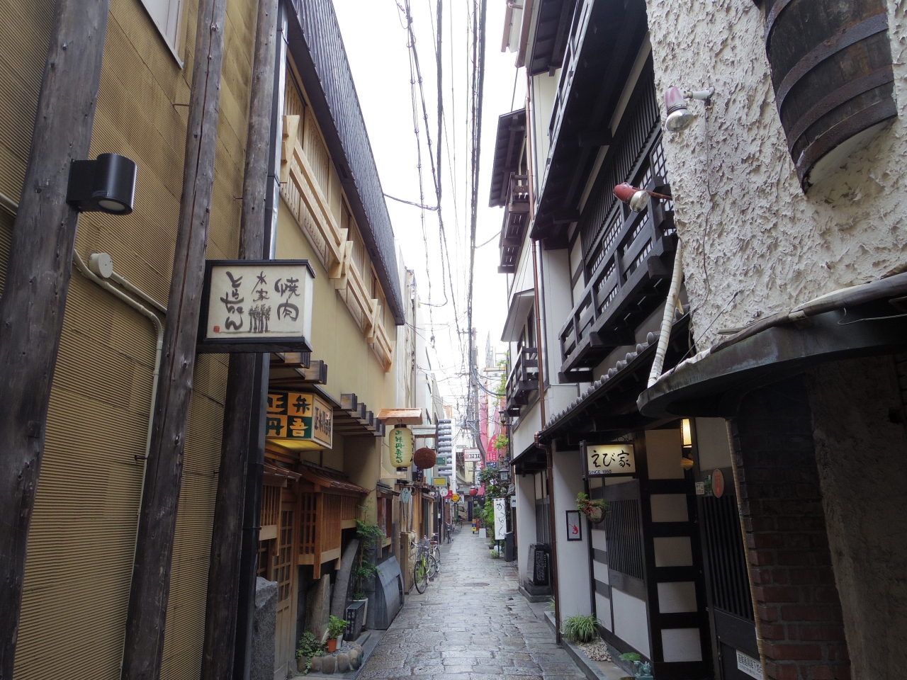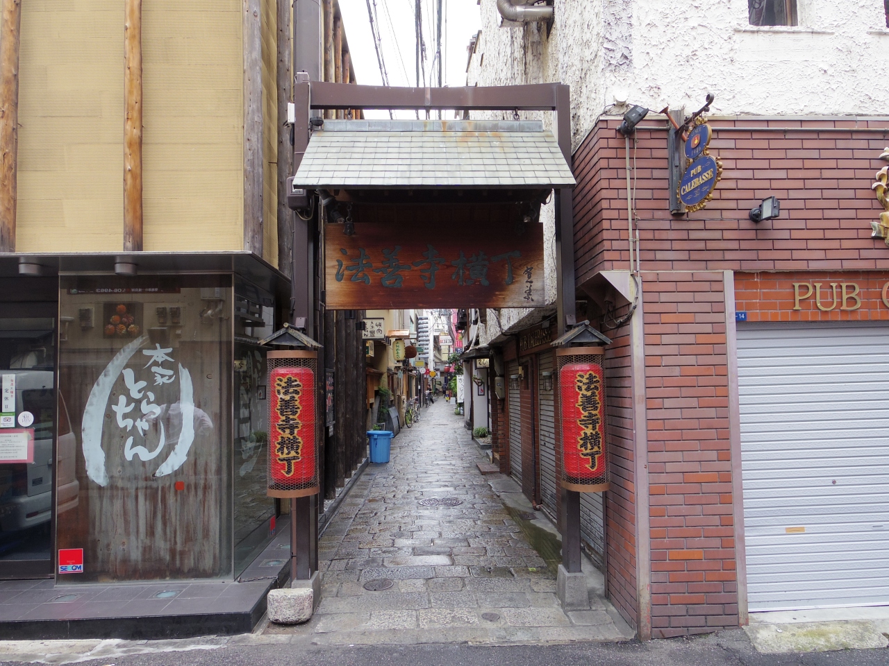 法善寺の北側の細い道には石畳が敷かれ、肩を寄せ合いながら飲食店やバーが軒を連ね、情緒のある町並みは、どこかなつかしいような感じもしてきました。