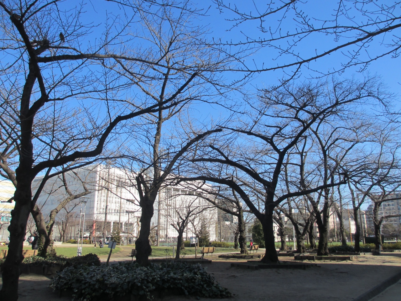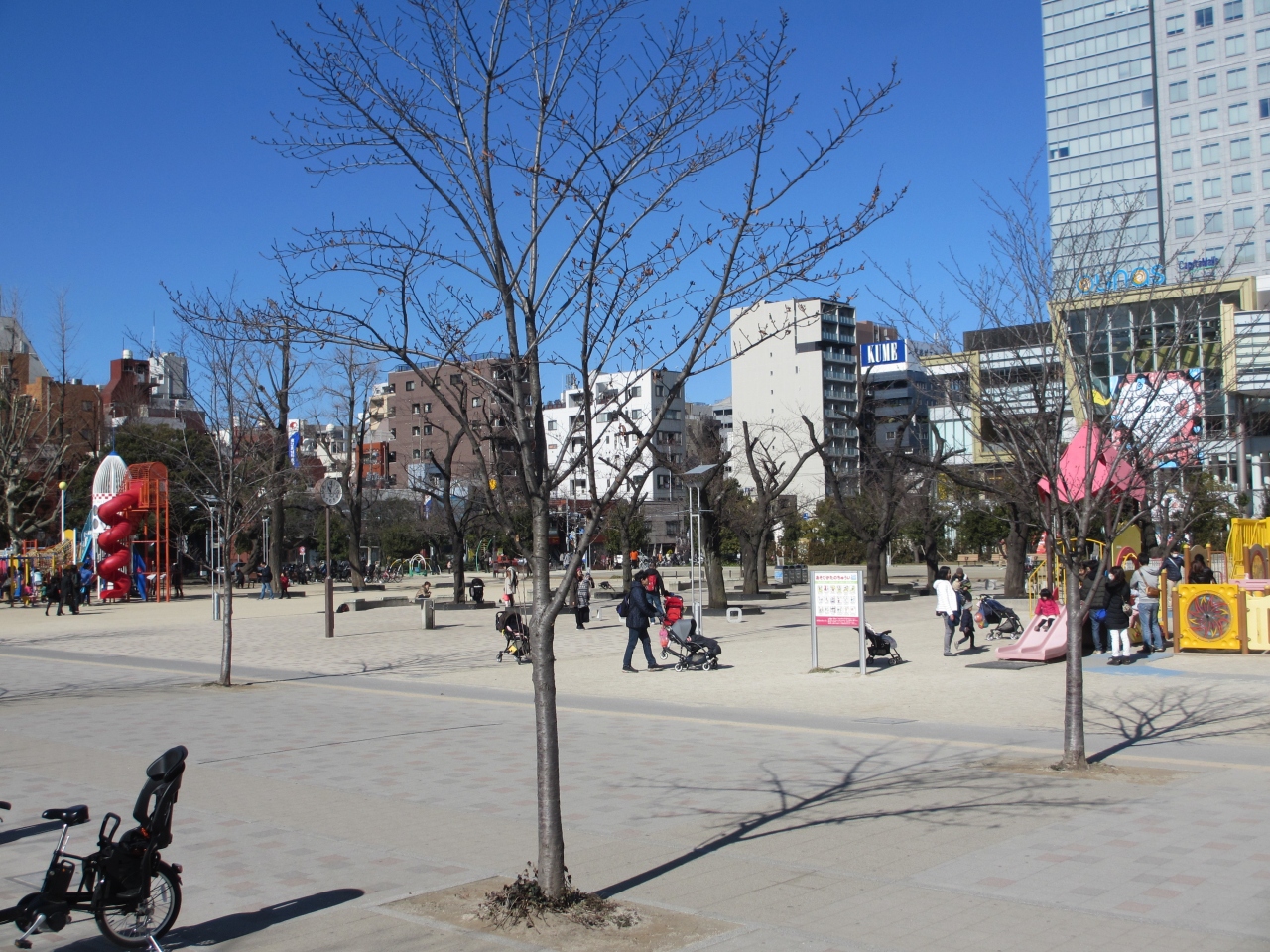 JR錦糸町駅北口から1分ほどのところにある広い公園です。800mのランニングコースの他、野球場、総合体育館、テニスコート、児童遊戯施設、広場などが備わっています。公園内には大きく成長した桜の木も植えられ、春には芝生に座り花見が楽しめます。スカイツリーも近くに見え、そびえている感じで眺めることもできます。広場には大人用の健康器具も備えられています。海抜-0.7mに位置していることもあり、災害時のための災害時用トイレも設置されています。訪れた日は天気も良く、多くの家族連れがやってきていました。区民のことを考えて造られた公園です。
