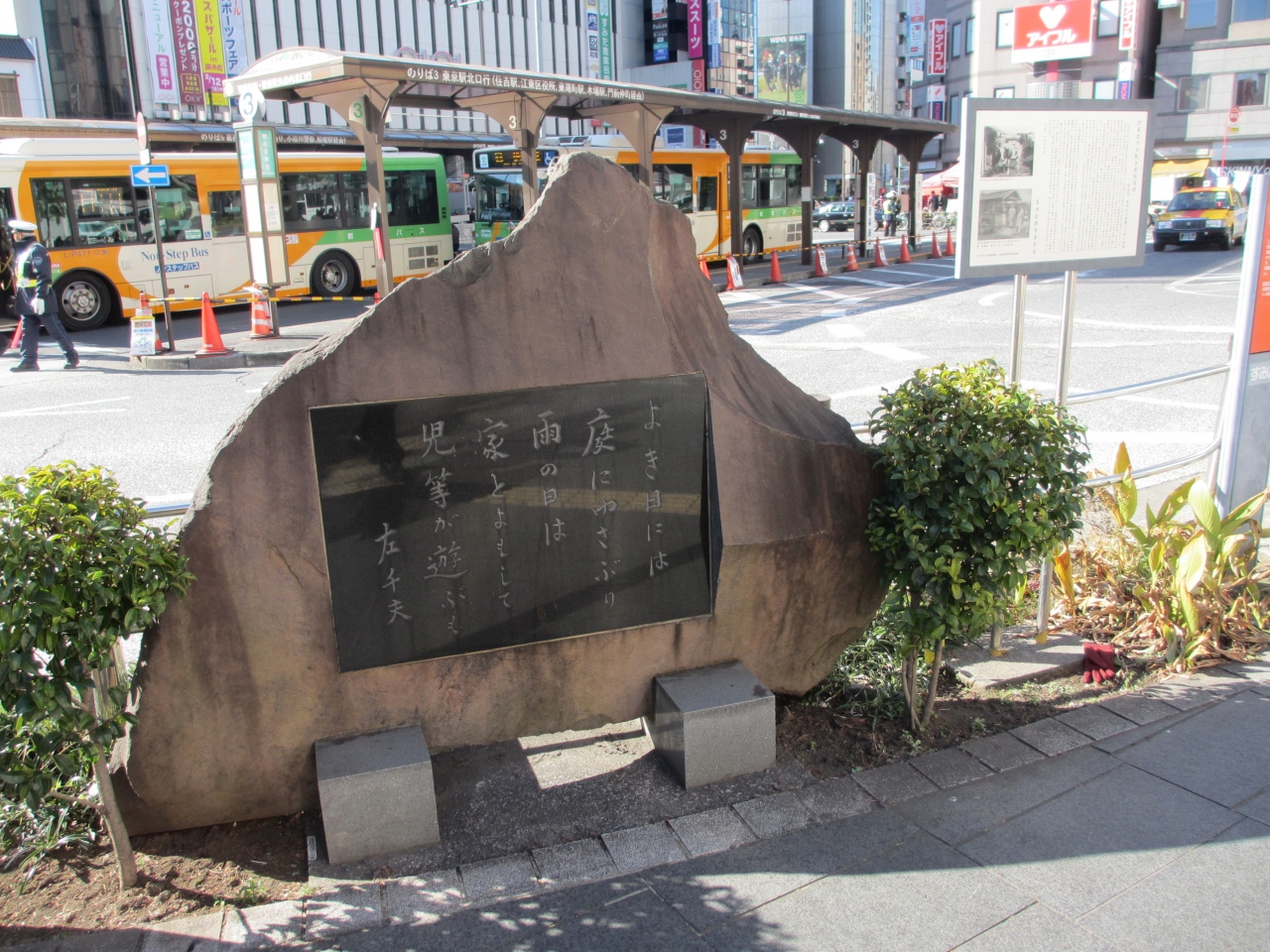 JR錦糸町駅南口ロータリーに碑と説明板が立っています。都バス案内所のすぐ近くです。伊藤左千夫が歌人で小説家であることは知っていましたが、この地で牧場を営んでいたことは知りませんでした。錦糸町駅前は大いに発展しビルが建ち並び、当時の面影は全く見られません。先日、亀戸周辺を歩いていて見つけた普門院に左千夫の墓を見つけました。著名であるにもかかわらず、墓は傾きかけ、シュロの木に覆われ薄暗く、その姿にがっかりしました。今回駅前に立つ立派な碑を見て、何か嬉しい気持ちになりました。左千夫も大きく発展した住居跡と堂々とした碑に喜んでいるに違いありません。