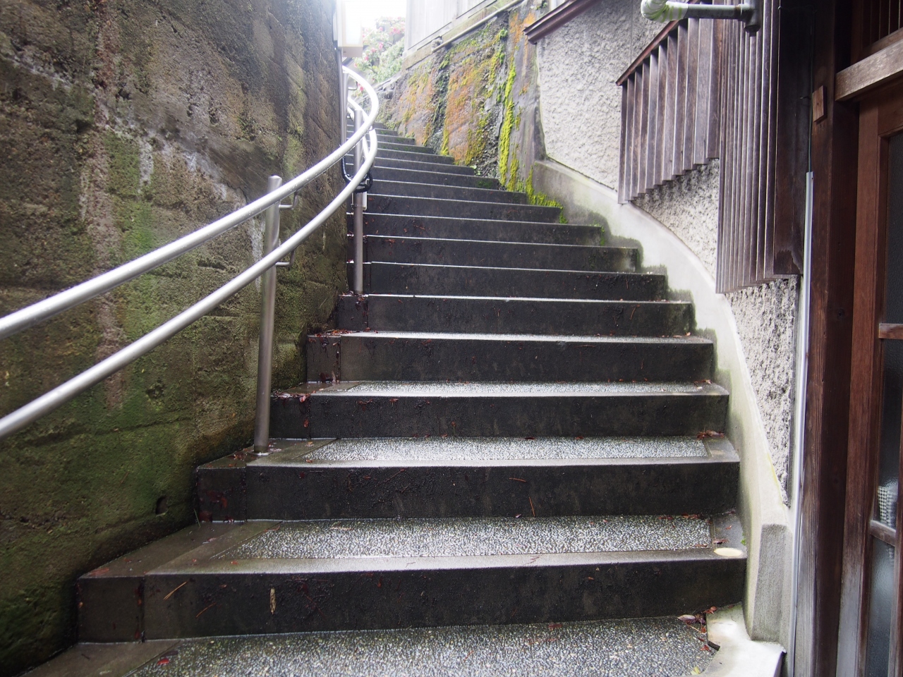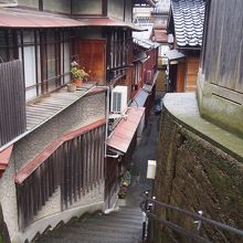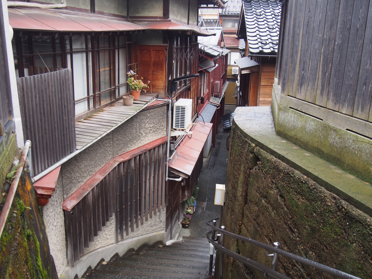 主計町茶屋街から久保市乙剣宮や金沢蓄音機館などへの抜け道です。茶屋街の家の路地裏という感じの細い道で、20から30mほどの階段、坂道です。狭い家の間を通るので暗い路地という感じから暗がり坂という名前が付いたと思われます。あかり坂は暗がり坂のひとつ横の通りで、少し幅広で日が差し込むのであかり坂という名前が付いていると思われます。主計茶屋街を歩いたときには立ち寄りた場所です。