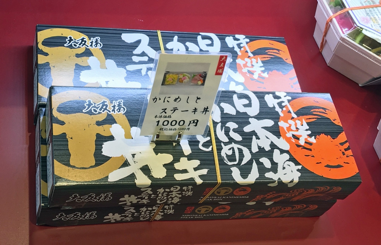 JR金沢駅直結の金沢百番街 おみやげ館にある大友楼で、帰りの新幹線内で食べるお弁当を購入しました。数あるお弁当屋さんの中から悩んだあげく大友楼を選びましたが、大友楼に来ても、お弁当の種類が多々あって、どれにするかかなり悩みました。選んだのは、特選日本海 かにめしとステーキ丼でした。
