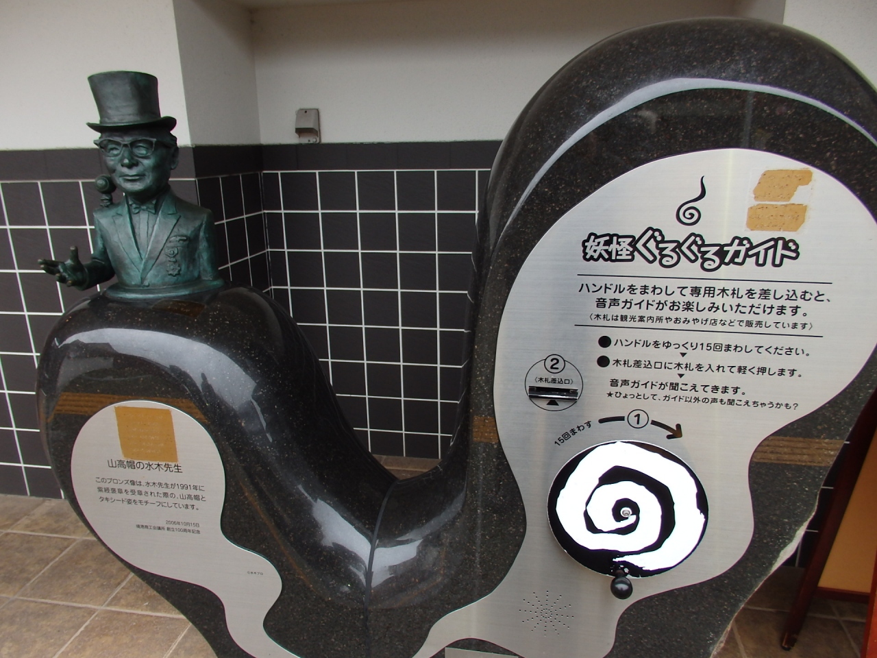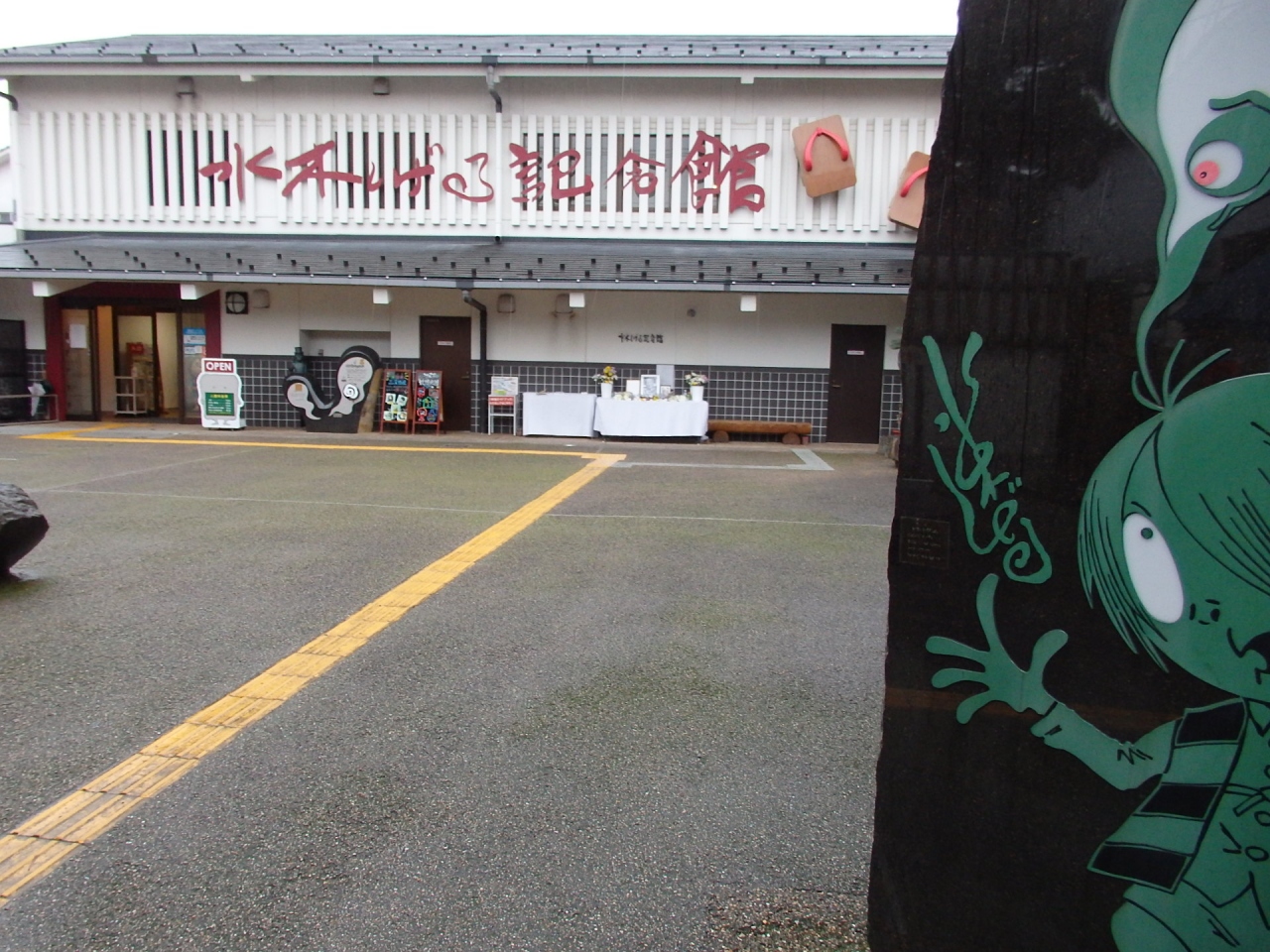 水木しげるロードを駅に向かって歩いていくと、右手に見えてきました。ロードの近くのまち全体が水木しげるの世界を表している感じでしたが、この記念館では、その世界を、水木さんが書かれた作品などで、詳しく説明されているので、よくわかりました。そのあと、また、ロードを歩くと、作品の中に引き込まれていくように感じました。