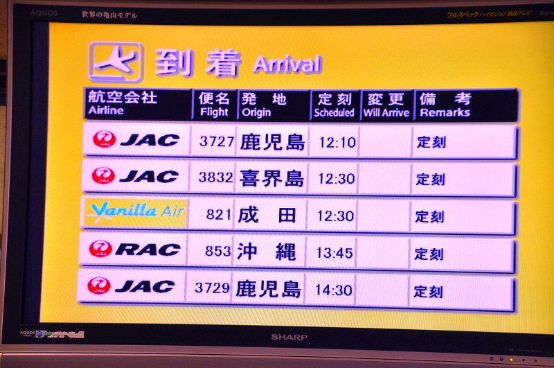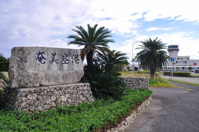 鹿児島県・奄美大島へ空路で行く場合の空の玄関。奄美大島の北端近くの海沿いにある。滑走路は長さ2000メートルが1本で、JAL系の日本エアコミューター、琉球エアコミューターと、LCCのバニラエアが飛んでいる。屋上の展望デッキは無料で入れるので、一日遅れで着く友人の到着をそのデッキで迎えた。到着ロビーには熱帯魚の入った水槽があり、この水槽越しにターンテーブルで待つ友人の姿も見えた。